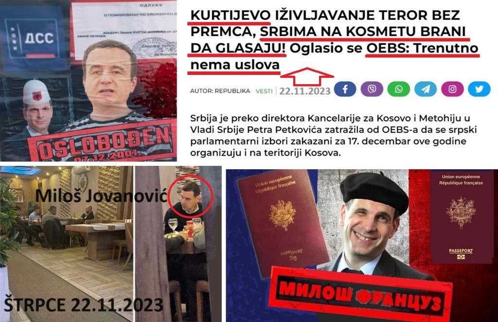Juče je bio 22.11.2023. godine, i upravo juče je Kancelarija za Kosovo i Metohiju Vlade Republike Srbije, konstatovala da je zbog neprihvatlјivih Kurtijevih uslova, nemoguće sprovesti glasanje na KiM. To je konstatovao i OEBS. Kurti traži, ni manje, ni više da Srbija potpiše priznanje lažne države Kosovo, pa da on dozvoli Srbima 17.12.2023. da glasaju na KiM, za izbore u Srbiji. Kurti, pored ostalog čini uslugu svim svojim saveznicima u Srbiji, i želi da umanji broj glasova za listu „Aleksandar Vučić – Srbija ne sme da stane“, zbog toga što 95% Srba na KiM, glasa za tu listu. Ovako će Srbi morati da idu izvan KiM, ako žele da učestvuju na srpskim izborima. Saveznici Kurtija su sve liste opozicionih stranaka, Đilasova i Marinikina, Dveri i Zavetnika, DSS Miloša Francuza itd. Kurti je odlučio da niko iz stranaka vlasti ne može ni da vrši kampanju na KiM. Niko iz stranaka vlasti. Stop za državu Srbiju, stop za OEBS. Fašista Kurti je dozvolio da opozicioni lideri mogu da dolaze na KiM i vode izbornu kampanju. Dužan im je. Đilas ga je toliko hvalio, kao i Jeremić. Stranka Miloša Francuza je pustila Kurtija na slobodu iz zatvora. Dveri i Zavetnici su organizovali snajperistu za Vučića. Cela opozicija je 2.2.2023. fizički napala predsednika Vučića u Skupštini i pokušala da ga linčuje. Uz to program Đilasove koalicije je priznanje lažne države Kosovo! Malo li je? Kurti je dužan srpskoj opoziciji, onoliko koliko je ružan. Mnogo!