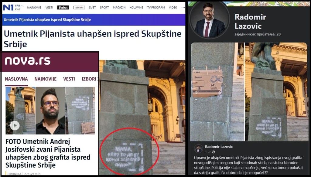 Koliko je trula Đilasova koalicija svedoči i najnoviji skandal opozicije. Podsetiću da je cela opozicija pre neki dan podržala Đilasovog poslanika Đorđa Miketića, koji je sam sebe snimio kako se drogira i kako učestvuje u lancu prostitucije. Danas je policija privela Andreja Josifovskog, koji sam sebe naziva laskavo „Umetnik Pijanista“, zbog toga što je vandalizovao Skupštinu Srbije (remek delo naše arhitekture), ispisivanjem uvredljivog grafita. U odbranu arhitekte i asistenta na Arhitektonskom fakultetu, Andreja Josifovskog, odmah su ustali Šolakovi mediji N1 i NovaS, osuđujući policiju što je privela „Umetnika Pijanistu“. N1 je na portalu objavio sramni tekst pod naslovom: „Umetnik Pijanista uhapšen ispred Skupštine Srbije“, dok je portal NovaS objavio sramni tekst pod naslovom: „Umetnik Andrej Josifovski zvani Pijanista uhapšen zbog grafita ispred Skupštine Srbije“. U oba teksta se citira prvi na Đilasovoj listi, četrdesettrogodišnji student Radomir Lazović, koji osuđuje policiju i brani Josifovskog. To i nije neko čudo, zbog toga što je Lazović pre par meseci vandalizovao RTS i REM, tako što im je uništio table na ulazima. Lazović kuka u ovim medijima, i po društvenim mrežama i kaže: „Upravo je uhapšen umetnik Pijanista zbog ispisivanja ovog grafita na stubu Narodne skupštine. Policija nije stala na hapšenju, već su kartonom pokušali da sakriju grafit. Pa dobro da li je moguće???“.