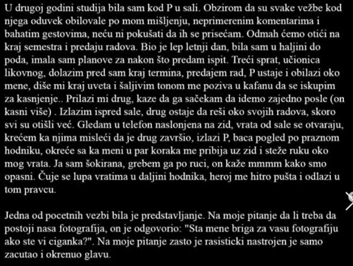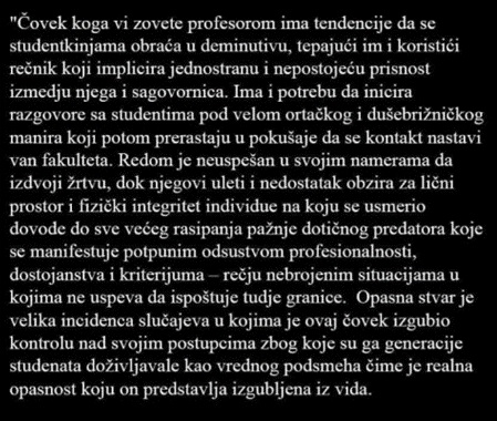 Problem u Đilasovoj i Šolakovoj podršci manijaku i vandalu Josifovskom se sastoji u tome što je on u junu prošle godine, od strane mnoštva studentkinja Arhitektonskog fakulteta, optužen da ih duže vreme seksualno uznemirava. Na fotografiji teksta, dole, „P“ označava „Pijanistu“, Josifovskog!