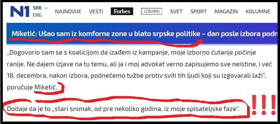 Zašto Dragan Đilas kaže 9.12.2023. na Šolakovoj TVN1 da Miketić ne treba da bude gradski odbornik i da bi mu on savetovao da podnese ostavku, ako je Miketić nevin kako tvrde svi Šolakovi i Đilasovi mediji? Dragan Đilas time priznaje da je Miketić kriv za posedovanje droge, učešće u lancu prostitucije, i da je kriv jer je izdao sopstvenu suprugu i decu, zbog toga što je koristio usluge prostitutke! Zbog toga Dragan Đilas kaže da Miketić ne treba da bude gradski odbornik! Time Dragan Đilas priznaje da za Miketićev snimak, koji je sam snimio, i za Miketićeva krivična dela, nikakvu odgovornost ne snose ni BIA, niti predsednik Vučić, što je celoj Srbiji jasno od početka afere Miketić.