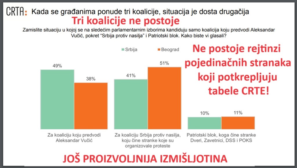 „CRTA“ je u oktobarskom istraživanju lagala da će Đilasova lista da osvoji značajno više od prostog zbira rejtinga pojedinačnih stranaka koje čine Đilasovu koaliciju. „CRTA“ je tvrdila da je prost zbir rejtinga stranaka Đilasove koalicije SPN 21%, a da je stvarni rejting Đilasove koalicije SPN, uz sinergijski efekat – 41%!?! Đilasova koalicija je osvojila 23,69%. „CRTA“ je promašila Đilasovu koaliciju za neverovatnih 17,3%! Sa druge strane „CRTA“ je tvrdila da je rejting vladajuće koalicije SNS-SPS -49%. SNS i SPS su osvojili 53,25%. „CRTA“ je vladajuću koaliciju promašila za neverovatnih 4,25%! Rezultat izbora 2023. je pokazao kolike su razmere lažnih istraživanja „CRTE“.