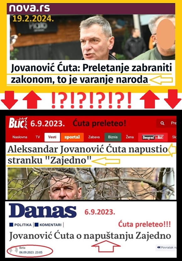 Izjave Ćute Preletačevića su urnebesno smešne iz više razloga. Izgleda da Ćuti nisu bile sve koze na broju (verovatno je bio pod uticajem psihoaktivnih supstanci – vinjaka i dr.), jer je fatalno zaboravio da je upravo on preleteo pre pola godine. Podsećam, svi mediji, pogotovo Šolakovi i Đilasovi su 6.9.2023. godine izvestili da je Ćuta Jovanović napustio stranku „Zajedno“ čiji je kopredsednik bio zajedno sa Nebojšom Zelenovićem i Biljanom Stojković. Ćuta je preleteo u stranku „Ekološki ustanak“. Tada su mediji preneli Ćutine izjave da je napustio stranku „Zajedno“ zbog toga što mu je predsednik gradskog odbora Beograd, stranke „Zajedno“, Đorđe Miketić, ukrao Fejsbuk stranicu!