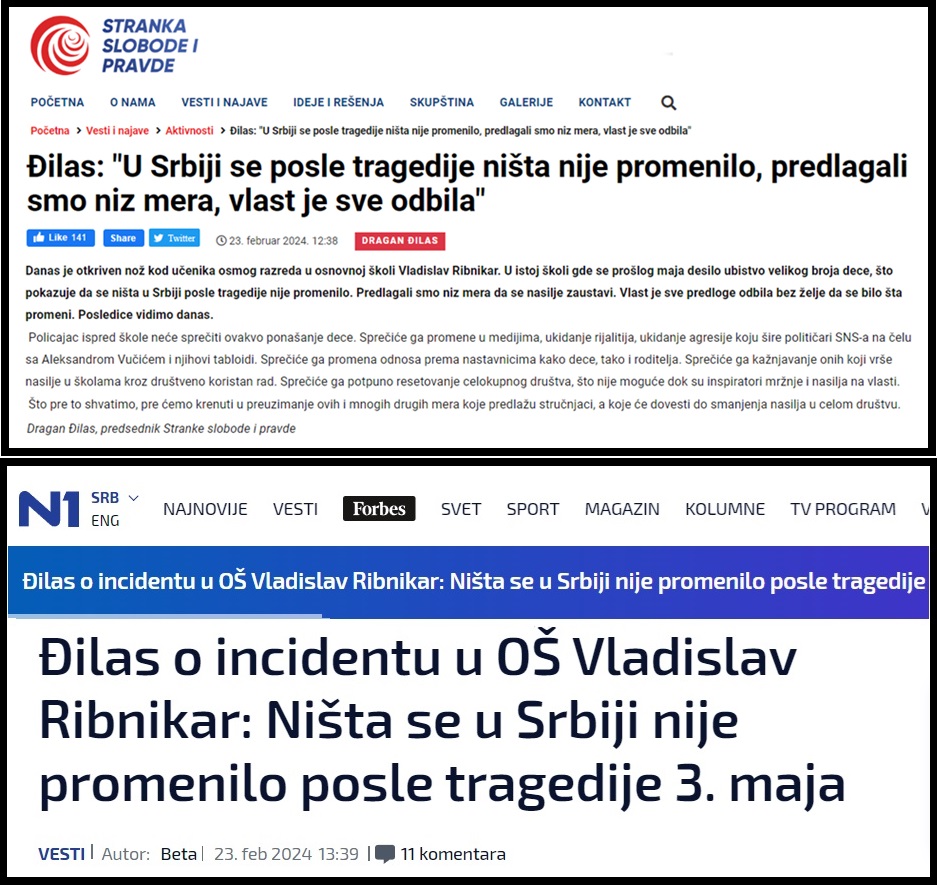 Parafraziraću čuvenu izreku – „Ko o čemu k…a Đilas o poštenju“. Nasilnik Dragan Đilas je 23.2.2024. dao skarednu izjavu: „Danas je otkriven nož kod učenika osmog razreda u osnovnoj školi Vladislav Ribnikar. U istoj školi gde se prošlog maja desilo ubistvo velikog broja dece, što pokazuje da se ništa u Srbiji posle tragedije nije promenilo. Policajac ispred škole neće sprečiti ovakvo ponašanje dece. Sprečiće ga promene u medijima, ukidanje rijalitija, ukidanje agresije koju šire političari SNS (…). Sprečiće ga promena odnosa prema nastavnicima kako dece, tako i roditelja. Sprečiće ga kažnjavanje onih koji vrše nasilje u školama kroz društveno koristan rad. Sprečiće ga potpuno resetovanje celokupnog društva, što nije moguće dok su inspiratori mržnje i nasilja na slobodi“.