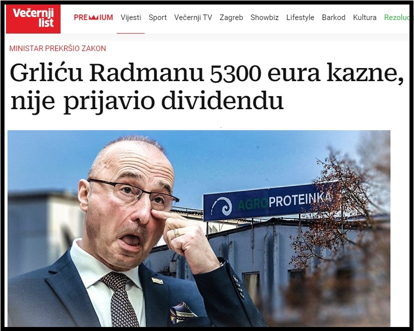 Plenkovićev ministar Grlić-Radman, je od 2019. do 2023. godine, na račun dividende, kao suvlasnik „Agroproteinke“ dobio 2,11 miliona evra. Ništa nije prijavio. Ministar Goran Grlić-Radman prekršio je Zakon o sprečavanju sukoba interesa, jer nije prijavio svu imovinu u imovinsku kartu, utvrdilo je hrvatsko „Povjerenstvu za odlučivanje o sukobu interesa“, koje je ministra Grlić-Radmana kaznilo maksimalnom kaznom od 5300 evra. Umesto da bude smenjen, on i Plenković su izrazili žaljenje i rekli da Radman priznaje da je pogrešio i da će platiti kaznu.