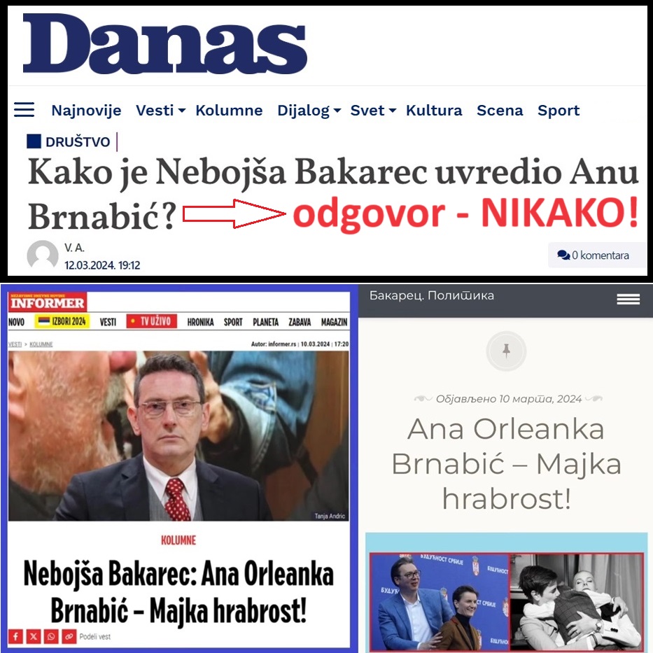 Pitate me u naslovu svog teksta „Kako je Nebojša Bakarec uvredio Anu Brnabić?“. Odgovoriću vam – nikako. Pitate da li sam uvredio Anu Brnabić, svojim tekstom u kome hvalim Anu Brnabić!?! Besmisleno. Obožavam kada me satanizuje „Danas“ i drugi Đilasovi i Šolakovi mediji! Dižu mi rejting i reklamiraju moj tekst o sjajnoj Ani Brnabić. Đilasovi mediji poručuju da će napasti svakoga ko hvali Anu Brnabić ili Aleksandra Vučića, ili bilo koga iz SNS. „Danas“ mi poručuje – NE SMEŠ DA HVALIŠ ANU BRNABIĆ! SMEM I HOĆU! Đilasov „Danas“ ne spori sadržaj mog teksta, već njegov naslov „ANA ORLEANKA BRNABIĆ – MAJKA HRABROST“ i kaže „Danas“ – time sam uvredio Anu Brnabić. ČIME? KAKO? Odgovor je NIKAKO!