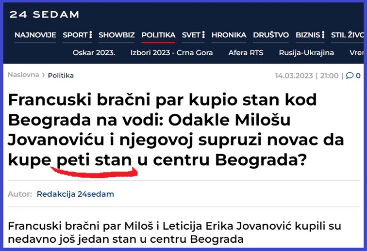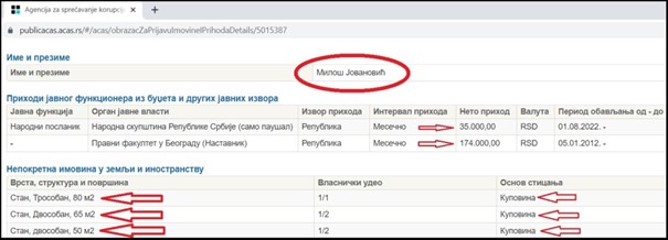 U Izveštaju poslanika Miloša Jovanovića, koji je 21.10.2022. podneo Agenciji za sprečavanje korupcije, stoji da je francuski državljanin Miloš Jovanović vlasnik tri stana i to: stana od 80 m2 (1/1), puno vlasništvo, stečeno kupovinom, pola stana od 65 m2 (u katastru stoji 71m2) (1/2), stečeno kupovinom, i vlasnik pola stana od 50 m2 (1/2), stečeno kupovinom. Dakle, po tom izveštaju Miloš Jovanović i supruga su vlasnici 201m2 stanova u centru grada. Kako se radi o novogradnji u centru, gde je vrednost metra kvadratnog 3000 evra, vrednost tih 201m2 po tržišnoj vrednosti je 603.000 evra! U „KRIK“-ovoj „Bazi imovine političara“ iz 2018. stoji da je sestra Miloša Jovanovića vlasnica stana u centru Beograda (Stari grad) koji vredi 105.000 evra. U bazi „KRIK“-a stoji da je majka Miloša Jovanovića vlasnica stana na Vračaru koji vredi 105.600 evra. Kad sve to saberemo, dolazimo do toga da porodica Jovanović ima nekretnine u vrednosti od 813.600 evra. Vrlo je verovatno de je porodica Jovanović vlasnik neke nekretnine u Francuskoj, čije vlasništvo nisu prijavili, zbog toga što znaju da naši organi teško mogu da detektuju tu imovinu. Portal „24sedam“ je 23.3.2024. godine izneo tvrdnju da je Miloš Jovanović, zajedno sa suprugom, vlasnik 5 stanova, od kojih je poslednji kupljen na teritoriji opštine Savski Venac, u ulici Aleksandra Glišića, u neposrednoj blizini Beograda na vodi. Kako je Miloš Jovanović stekao nekretnine vredne 603.000 evra, ne računajući stan koji pominje portal „24sedam“?