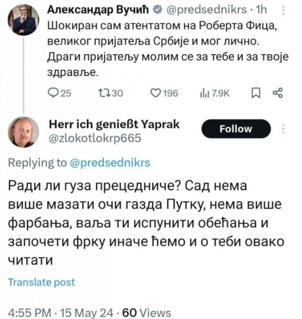 Najoštrije osuđujem pretnje smrću upućene predsedniku Republike Srbije Aleksandru Vučiću. Dve majske tragedije nisu opametile bolesnike i ludake. Vidimo da ima poremećenih koji su inspirisani pokušajem ubistva Roberta Fica, i sada prete ubistvom predsedniku Vučiću. Podsećam da su upravo ovakvi bolesnici i ludaci koji smrću prete predsedniku Vučiću, ubili premijera Zorana Đinđića. Ovakvih ubilačkih ludaka u Srbiji ima mnogo, i hvale se da su pripadnici opozicione elite, da će nas juriti po ulicama, bacati u reke. Godinama pišem i upozoravam na dehumanizaciju predsednika Vučića i njegove porodice. Pretnje smrću traju 10 godina, ali predsednika Vučića nisu uplašile ni malo. Pozivam nadležne institucije da hitno reaguju. Bezrezervna podrška predsedniku Vučiću. PORUKA NADLEŽNIM ORGANIMA – HITNO POJAČATI MERE OBEZBEĐENjA PREDSEDNIKA VUČIĆA!