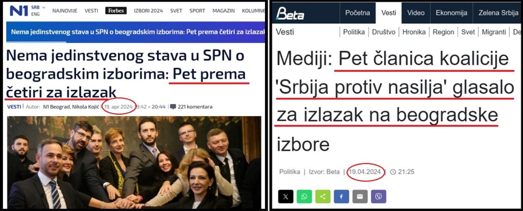 Iz poslednje citirane rečenice se vidi šta g. Ilić podrazumeva pod dogovorom u SPN – „nema izbora dok se ne poprave uslovi za izbore“. Ako je to pre pola godine, zaista i bio dogovor unutar SPN, to je postalo irelevantno zbog toga što je 19.04.2024. godine, na sastanku predsedništva koalicije SPN, postignut poslednji dogovor, konačni dogovor – doneta je odluka o izlasku na izbore 2. juna 2024. godine, glasanjem šest prema tri. Odluka je doneta, prvo sa pet prema četiri, ali je četvrta stranka koja je glasala protiv – DS, rekla da će se prikloniti odluci većine, pa je konačan rezultat glasanja bio šest prema tri. Pokazalo se da je to i poslednji dogovor, štaviše demokratska, dvotrećinska odluka. Ta odluka je doneta na način na koji su tokom postojanja te koalicije, uvek donošene odluke – glasanjem. Lideri stranaka te bivše koalicije su govorili da odluke često nisu donošene jednoglasno, ali da je manjina uvek poštovala odluku većine. Uvek – izuzev odluke donete 19.4.2024. Nepoštovanje dogovora, tj. odluke većine je dovelo do raspada koalicije SPN, istog tog 19.4.2024. Šest stranaka je odlučilo da izađe na izbore i da poštuje dogovor, a tri stranke su se opredelile za bojkot i da ne poštuju dogovor.
