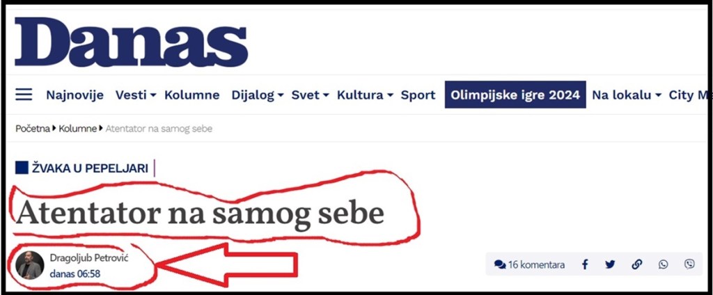 Dragoljub Petrović, glodur Šolakovog antisrpskog lista „Danas“ je 18.7.2024. objavio u Danasu, svoju sramnu kolumnu pod nazivom „Atentator na samog sebe“. U toj kolumni Petrović nastavlja da dehumanizuje predsednika Vučića, šireći ogavnu tezu da su pripremani atentati na Vučića, Vučićeva izmišljotina, da se u Srebrenici nije dogodio pokušaj ubistva predsednika Vučića. Dragoljub Petrović je izneo još niz gadosti. U svojoj sramnoj kolumni u Danasu, Petrović kaže: „Tramp je bio samo kulisa za atentat na Vučića, jedno 150. jubilarni atentat na Vučića. Ana Brnabić, kako je to pisalo u tabloidima, poslala je snažnu poruku posle atentata na Trampa, mada ta poruka nije bila snažna koliko je bila tupava. U snažnoj budalaštini Ane Brnabić (…) Ti atentati su više svrstani u čudesni žanr samoatentata, jer je o atentatima na samog sebe isključivo pričao predsednik, zatim njegovi mediji i njegovi stranački i vanstranački poltroni (…) Što bi bio odličan fazon, bar kao podrška nekome ko toliko manijakalno izmišlja sopstvene atentate i pripreme sopstvenih atentata. (…) čoveku koji kao da priželjkuje da mu se nešto desi, iako mu se srećom ništa ne dešava, samo zato da bi bio pljunuti Đinđić. (…) ne optužuju nikoga da hoće da ih ubije zato što oni imaju šićardžijsku projekciju da je dobro za njih ako izgleda da neko hoće ih ubije. Tada je isti ovaj Vučić aplauzom pozdravio reči svog tadašnjeg šefa: „Ako vidite negde Zorana Đinđića, kažite mu da je i Tito pred smrt imao problema s nogom“, a koju godinu ranije reči istog tog šefa: „Nije mi žao što je ubijen Ćuruvija“. I možete misliti koji su to ljudi koji su se radovali ubistvima novinara i metaforično najavljivali ubistva političkih protivnika, a koji sada non-stop žele da izvrše samoatentat, jer to je dokaz njihove grandioznosti. Atentator na samog sebe sve to gleda i uživa, jer svaki samoatentator računa da će u njegov samoatentat poverovati (…)“.
