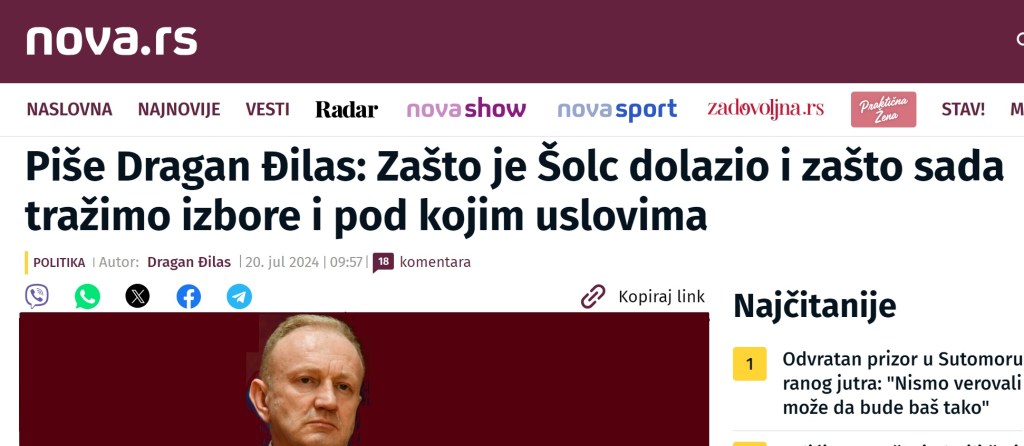 Sujeta je čudo. Zapanjuje potreba Dragana Đilasa da svaki čas piskara po svojim medijima, kada ima pristup dvema televizijama, 24 časa, na izvolte. Sujeta, ponavljam. Drugo, Đilasu je dosadno. Opšte je poznato da niko neće da živi sa njim, čak ni Marinika. Onog žutog psa je pretukao pre dve godine i otarasio ga se. I sad mu je dosadno. I udri, piši, briši. „Nova“ je objavila novo Đilasovo piskaranje pod naslovom: „Piše Dragan Đilas: Zašto je Šolc dolazio i zašto sada tražimo izbore i pod kojim uslovima“.