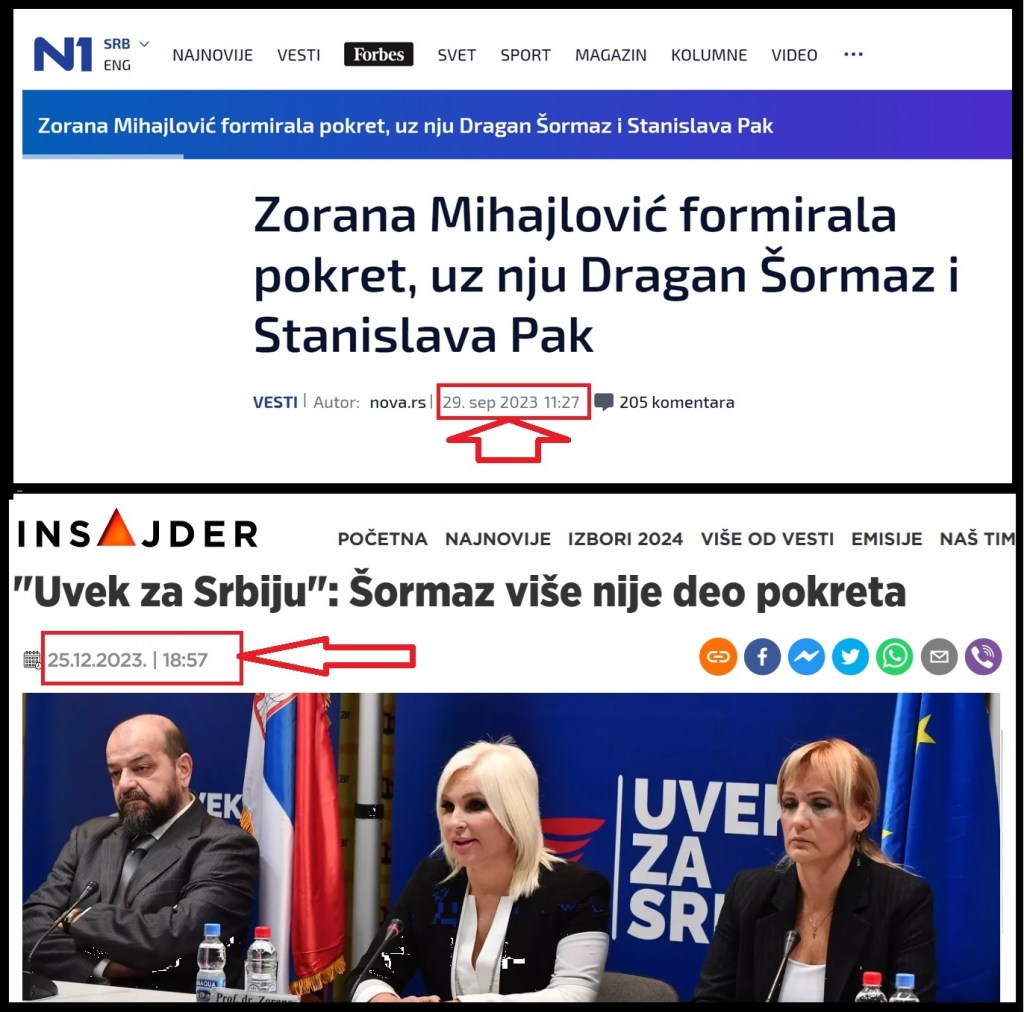 Već 25.12.2023., u Šolakovim medijima je objavljena vest da je Dragan Šormaz isključen iz pokreta „Uvek za Srbiju“ Zorane Mihajlović. On je tvrdio da je sam napustio taj Pokret. Dakle, Šormaz je izdao i Zoranu Mihajlović. Koštunca, Vučić, Mihajlović – tri potpuno različite politike i ličnosti, ali niko od njih nije bio dovoljno dobar za Šormazovu sujetu i bolesne ambicije.