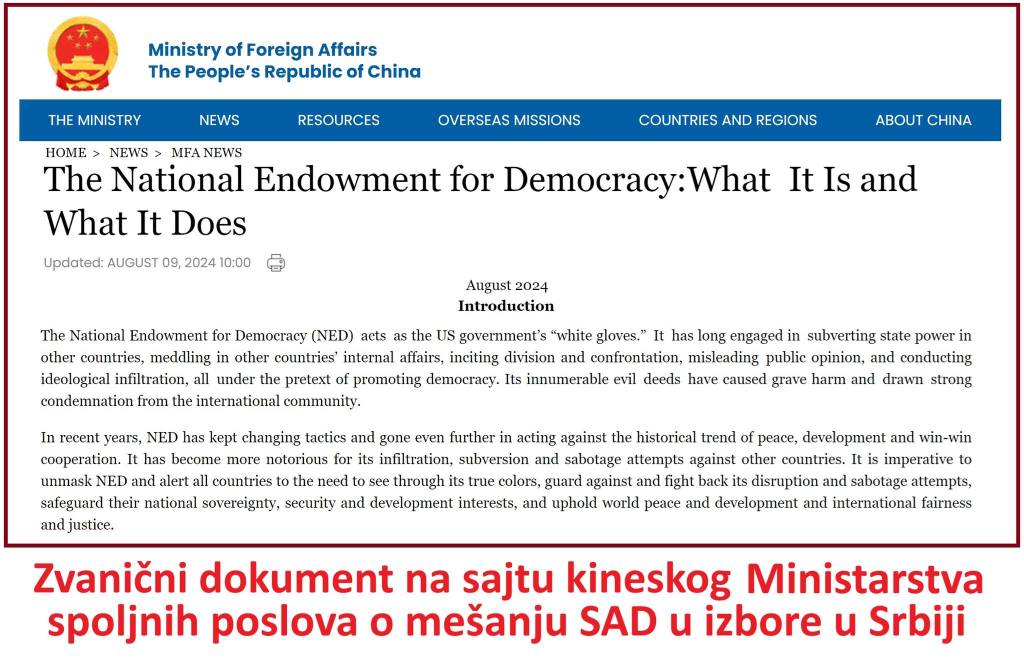 Narodna Republika Kina je zvanično objavila u zvaničnom dokumentu Ministarstva spoljnih poslova, da iza protesta i demonstracija u Srbiji, 2022. i 2023., stoje direktno SAD, tj. „NED“ – Nacionalni fond za demokratiju (National Endowment for Democracy) koji finansira i organizuje proameričke i proevropske nevladine organizacije, koje su upriličile proteste, u cilju nasilnog rušenja srpske Vlade i celog državnog rukovodstva. NED je zvanična, vladina, državna organizacija SAD odnovana 1983., koju finansiraju Kongres i Ministarstvo inostranih poslova SAD. NED je do sada uložio stotine miliona dolara u antisrpske NVO, koje uglavnom imaju cilj da ruše Predsednika Srbije i Vladu Srbije. Stejt dipartment je indikativno, demantovao ovo, čime je u stvari to potvrdio. Bolje da su ćutali.