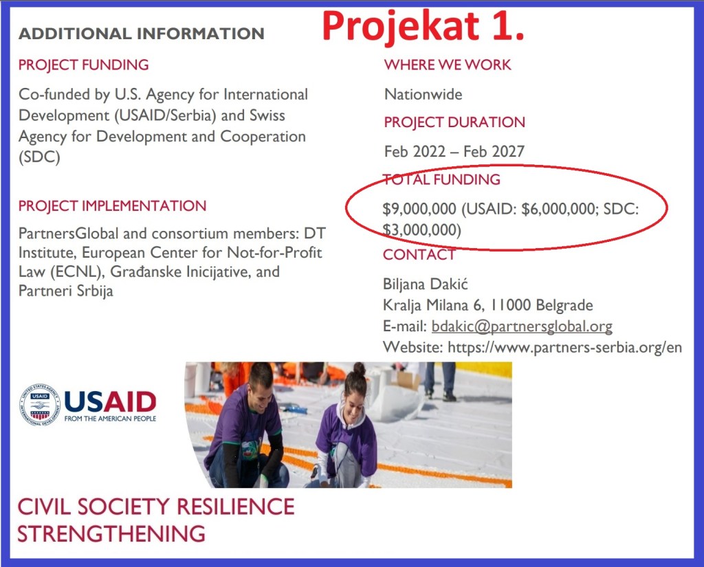 Drugi primer – Projakat 1. Projekat 1. je program USAID „Jačanje otpornosti organizacija civilnog društva“ („Civil Society Resilience Strengthening“). Glavni korisnik ovih 9 miliona dolara je antisrpska NVO „Građanske inicijative“ poznata po zastupanju stava da je Srbija počinila genocid u Srebrenici. Ovaj program, kao što i naslov kaže, služi da jača antisrpske NVO u Srbiji. Američka vladina fondacija USAID i Švajcarska vladina agencija za razvoj i saradnju („Swiss Agency for Development and Cooperation“ – SDC) će od 2022. do 2027. pokloniti 9 miliona dolara, antisrpskim NVO kao što su Građanske inicijative i „DT Institut“i „Evropski centar za neprofitno pravo“, preko organizacije „Partneri Srbija“ koja radi u Beogradu. SAD daju 6 miliona dolara, a Švajcarska daje 3 miuliona dorara za rušenje Srbije i Vučića!?! To stoji na sajtu USAID na donjoj adresi.