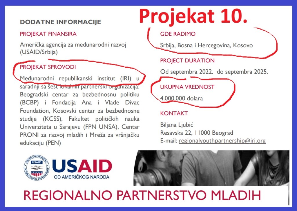 Peti primer – Projekat 10. Regionalno partnerstvo mladih (Regional Youth Partnerships) – 4 miliona dolara, Regionalno partnerstvo mladih je trogodišnji regionalni projekat koji služi jačanju veza antisrpski orijentisanih mladih iz Srbije sa takođe antisrpski mladima iz Bosne i Hercegovine (BiH), i iz lažne države Kosova. Projekat sprovodi američki Međunarodni republikanski institut (IRI) u saradnji sa šest lokalnih antisrpskih organizacija:Beogradski centar za bezbednosnu politiku(BCBP) i Fondacija Ana i Vlade Divac, Kosovski centar za bezbednosne studije (KCSS), Fakultet političkih nauka Univerziteta u Sarajevu (FPN UNSA), Centar PRONI za razvoj mladih i Mreža za vršnjačku edukaciju (PEN) (oba sa Kosova).