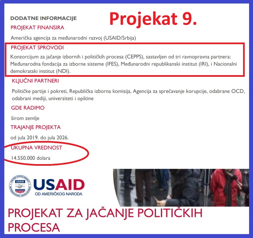 Četvrti primer – Projekat 9. Projekat za jačanje političkih procesa (Political Processes Strengthening project) 14,5 miliona dolara. Projekat sprovode američke organizacije Međunarodni republikanski institut (IRI), i Nacionalni demokratski institut (NDI), i zapadna (u suštini američka) organizacija Međunarodna fondacija za izborne sisteme (IFES). Svi sprovode projekat američke moći i mešanja u izbore odabranih država. U suštini ovaj projakat služi slabljenju, a ne jačanju izbornih i političkih procesa u Srbiji.