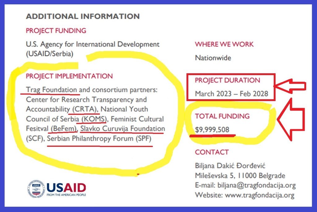 Podsećam CRTA je NVO konzorcijum različitih antisrpskih organizacija (Crta, Istinomer, Otvoreni parlament…) i otvoreno radi protiv države Srbije. KOMS (Krovna organizacija mladih) je antisrpska NVO, inače paravan organizacija koju vode agresivni nasilnici poput Ivana Bijelića, koji je nedavno blokirao Železničku stanicu Centar (Prokop) i prugu Beograd – Novi Sad. Dakle, USAID plaća razne ludake da blokiraju srpske pruge i da ruše Srbiju i srpsku privredu. Fondacija Slavko Ćuruvija, je takođe antisrpska NVO koja neprestano blati i Srbiju i predsednika Vučića.