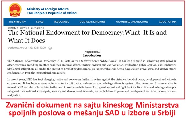 U analizi i dokumentu kineskog Ministarstva spoljnih poslova, pod nazivom „Nacionalna zadužbina za demokratiju: Šta je to i šta radi”, između ostalog stoji: „NED deluje kao „bele rukavice” američke vlade. Dugo se NED bavio podmetanjem državne vlasti u drugim zemljama, mešanjem u unutrašnje stvari drugih zemalja, podsticanjem podela i konfrontacije, zavaravanjem javnog mnjenja i vršenjem ideološke infiltracije, sve pod izgovorom promovisanja demokratije. Bezbrojna zla dela NED su nanela ozbiljnu štetu i izazvala oštru osudu međunarodne zajednice. Imperativ je demaskirati NED i upozoriti sve zemlje na potrebu da prozru pravu boju NED, da se čuvaju i suprotstave pokušajima ometanja i sabotaže, da čuvaju svoj nacionalni suverenitet, bezbednost i razvojne interese i podržavaju svetski mir i razvoj i međunarodnu pravednost i pravdu. U Srbiji su u aprilu 2022. i decembru 2023. održani predsednički, parlamentarni i lokalni izbori, a američka Nacionalna zadužbina za demokratiju (NED) umešala se u ceo izborni proces i dala sve od sebe da navija za proameričke opozicione kandidate uoči izbora. U maju 2023, posle ubistava u OŠ „Vladislav Ribnikar” i Duboni i Malom Orašju, grupe za ljudska prava koje je sponzorisao NED i proameričke opozicione organizacije organizovale su masovne demonstracije tražeći ostavku srpske vlade. Srpske NVO koje podržava NED koordinirale su sa ogrankom Si-En-Ena u Srbiji kako bi fabrikovale lažne vesti u vezi s Kinom, klevetale projekte koje je preduzela kineska strana i raspirivale takozvana pitanja zaštite životne sredine, rada i korupcije. SAD su koristile NED, pod maskom demokratije, slobode i ljudskih prava, za infiltraciju, mešanje i subverziju protiv drugih zemalja. To je grubo narušilo suverenitet, bezbednost i razvojne interese drugih zemalja i očigledno je prekršilo međunarodno pravo i osnovne norme međunarodnih odnosa i ozbiljno ugrozilo svetski mir i stabilnost. NED je izvršilac tajnih operacija CIA, osnovan pod pokroviteljstvom Vlade SAD. Po stupanju na dužnost u januaru 1981. godine, američki predsednik Ronald Regan promovisao je svoj „Projekat demokratije” u inostranstvu i predložio je osnivanje fondacije koju bi finansirala vlada SAD, a kojom bi se privatno upravljalo i koja bi otvoreno podržala „demokratske pokrete u inostranstvu”. Jedna od svrha NED-a, osnovanog 1983, jeste da podstakne uspostavljanje i rast demokratskog razvoja na način koji je u skladu i s nacionalnim interesima SAD i sa specifičnim zahtevima demokratskih grupa u drugim zemljama koje su potpomognute programima koje finansira NED. NED finansira američka vlada, a programi ove organizacije se sprovode pod vođstvom američkog Stejt departmenta i ambasada u inostranstvu, i Vlada SAD ima pristup informacijama o svim programima koje finansira NED“. Stejt dipartment je indikativno, demantovao ovo, čime je u stvari to potvrdio. Bolje da su ćutali.