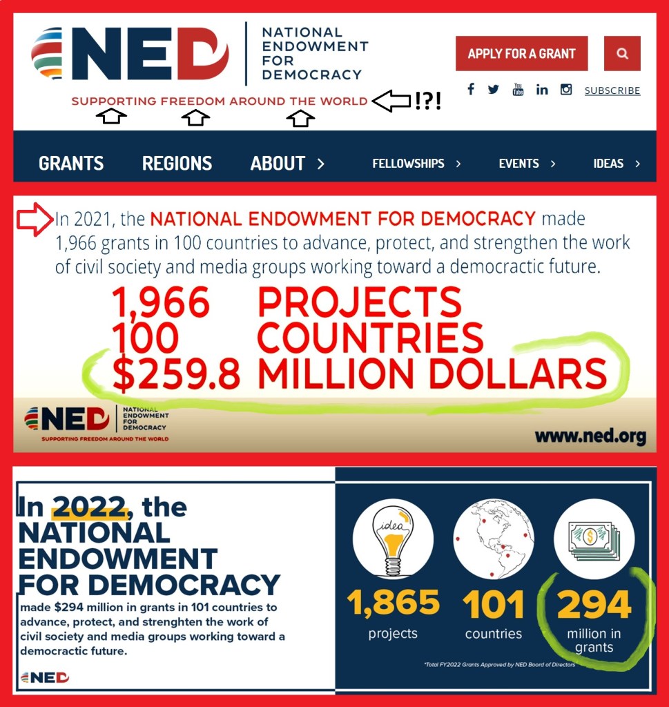 Da sumiramo – NED je tokom 2021. dodeljivao sredstva isključivo antisrpskim NVO! Dodelio im je, tj. poklonio ukupno 4.279.000 dolara – preko 4 miliona dolara. Sve ove organizacije već godinama rade na rušenju Srbije i predsednika Vučića. Možemo osnovano pretpostaviti da je NED tokom 2022, 2023. i 2024. značajno povećao finansiranje antisrpskih NVO sa ciljem rušenja Vučića. Pitanje za NED je – zbog čega krijete podatke za 2022. i 2023. za Srbiju? Takođe, na sajtu NED postoji zbirni podatak koliko je NED uložio novca u 2021. i 2022. godini širom sveta. U 2021. godini NED je uložio 259,8 miliona dolara Vlade SAD u „širenje demokratije“ u 100 država, kroz 1966 projekata (a svi projekti su presipanje iz šupljeg u prazno). U 2022. godini NED je uložio 294 miliona dolara Vlade SAD u „širenje demokratije“ u 101 državi, kroz 1865 projekata (a svi projekti su taština praznine). Ne treba zaboraviti da su ovo samo javni podaci. Postoji i ogromna količina keša – gotovine u dolarima, i drugoj valuti, koje SAD bez problema prebacuju po svetu, putem diplomatske pošte, koju niko ne pregleda. Ti džakovi se ne otvaraju. Setimo se da to isto što radi NED, rade i USAID i Stejt dipartment, koji rapolažu još većim sredstvima nego NED.