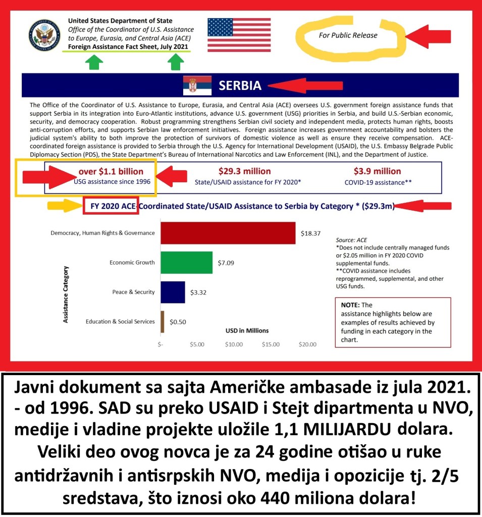 Za kraj, prikazaću vam javni dokument sa sajta Ambasade SAD, iz jula 2021. godine, koji pre svega govori koliko su novca u Srbiju – u NVO, medije, opoziciju i vladine projekte uložili USAID i Stejt dipartment u 2020. godini. Uložili su 29,3 miliona dolara. Računajte da je 2/5 tog novca otišlo antisrpskim NVO, medijima i opoziciji, a to je oko 12 miliona dolara. Međutim, mnogo je interesantniji podatak – zbirni podatak, a šokantan podatak o tome koliko su USAID i Stejt dipartment, uložili novca u u NVO, medije, opoziciju i vladine projekte, od 1996. zaključno sa 2020. godinom, dakle za 24 godine. U dokumentu stoji da su uložili 1,1 milijardu dolara za 24 godine. Veliki deo ovog novca je za 24 godine otišao u ruke antidržavnih, antisrpskih NVO, medija i opozicije – odnosno 2/5 ili 440 miliona dolara. Do sada sam uočio zakonitost da SAD u Srbiju ulažu 3/5 sredstava u konstruktivne svrhe, a 2/5 sredstava u destruktivne svrhe. No, dok je Srbiji Vučiča i Srpske napredne stranke – nema brige. Predsednik Vučić i SNS se već 12 godina uspešno bore sa marifetlucima zapada. Živela slobodna Srbija!