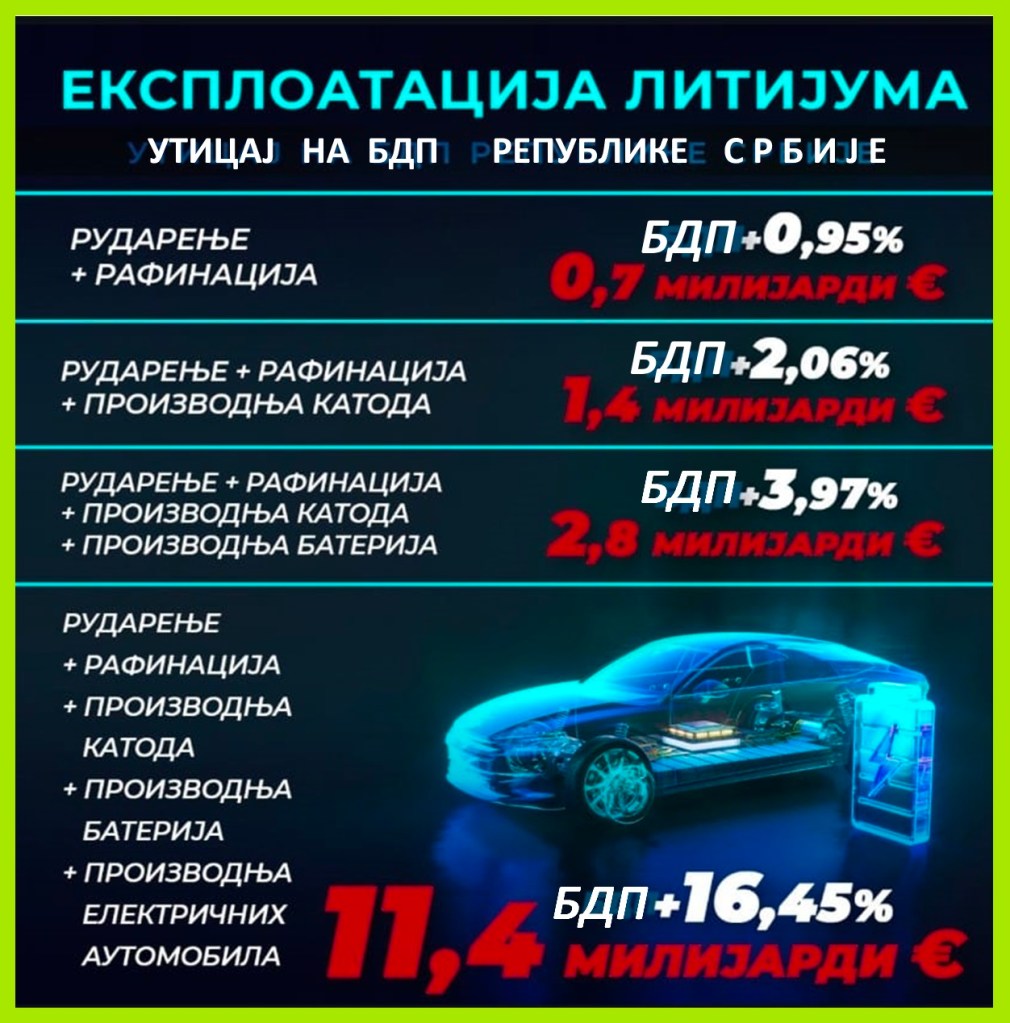 Ukoliko bude odobren, projekat „Jadar“ bi bio jedna od najvećih industrijskih investicija u Srbiji i donosio bi ogromne direktne i indirektne prihode u okviru BDP-a. Eksploatacija litijuma imala bi gigantski pozitivan uticaj na BDP Republike Srbije. Takozvani lanac vrednosti u slučaju Srbije i litijuma može da podrazumeva 5 nivoa. 1. Rudarenje 2. Rafinaciju 3. Proizvodnju katoda 4. Proizvodnju baterija i 5. Proizvodnju drugog električniog automobila. Ostvarenje nivoa 1. i 2., podiže naš BDP za 1% (700 miliona evra godišnje). Ostvarenje nivoa 1. 2. i 3., podiže naš BDP za 2% (1,4 milijardi evra godišnje). Ostvarenje nivoa 1. 2. 3. i 4., podiže srpski BDP za 4% (2,8 milijardi evra godišnje). Ostvarenje svih 5 nivoa iz lanca uspeha, podiže naš BDP za 16,45% (11,4 milijardi evra godišnje). Zbog toga je ovo životna i razvojna šansa za Srbiju, kakva se ukazuje jednom u sto godina. Bila bi ogromna šteta da ne iskoristimo tu priliku. Pametnom dosta!