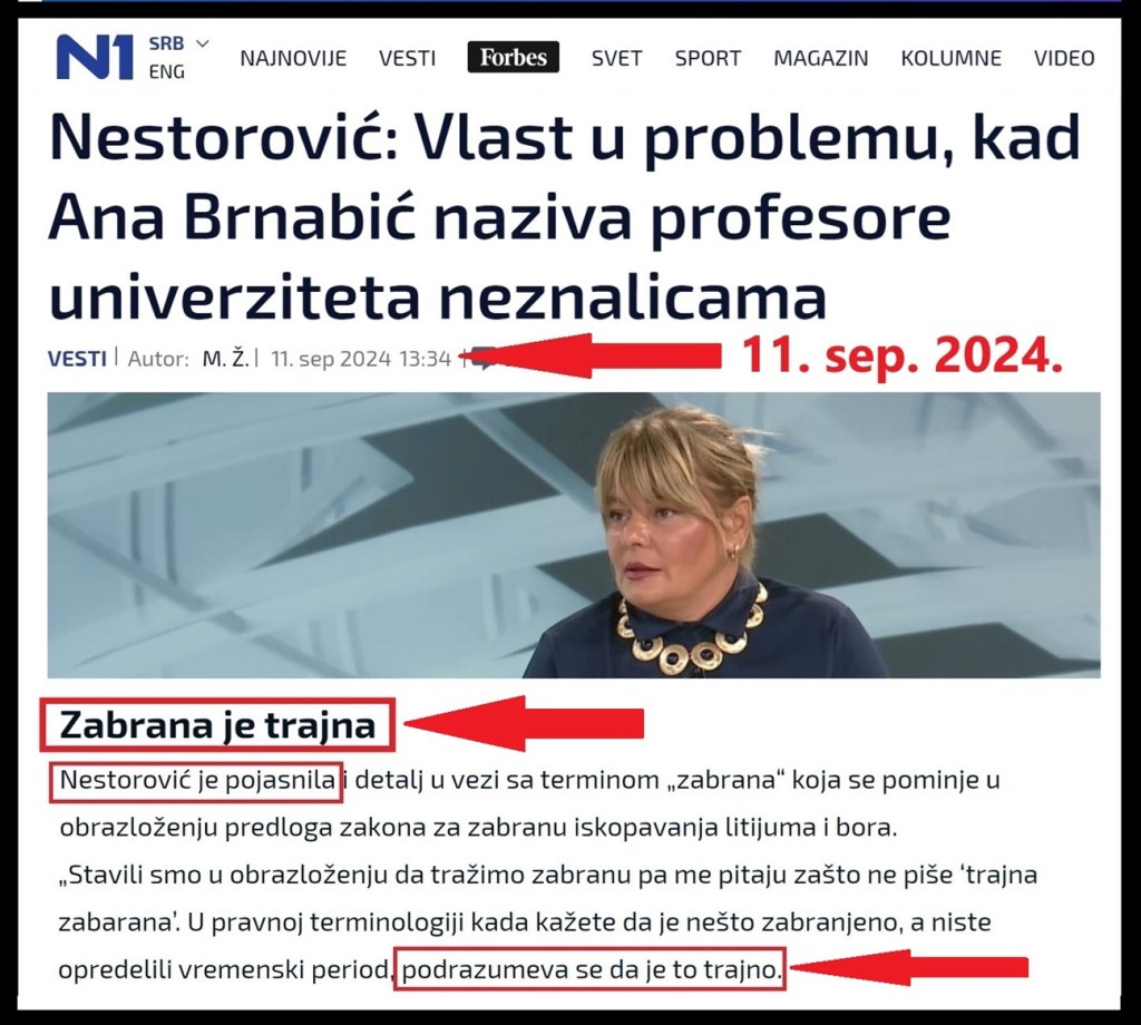 Sutradan, 11.9.2024. na TV N1, u emisiji Tanje Aleksić „Studio N1 live“ Danijela Nestorović, tvrdi suprotno, da je predložena zabrana trajnog karaktera! Na pitanje Tanje Aleksić: „Ono što je izazvalo reakcije kod vlasti je navođenje izjave Dragane Đorđević o tome da će se sumporna kiselina zagrevati na 250 stepeni u procesu izdvajanja litijuma, što je posle demantovala i sama Đorđević, ali je ta izjava ostala u predlogu zakona o zabrani iskopavanja litijuma i bora“, Danijela Nestorović kaže: „Sam predlog zakona sam pisala pre dva meseca, Dragana Đorđević je ispravila tu informaciju, videli smo pre neki dan. Ja zaista nisam želela da povlačim predlog, kako bih pustila novi. Ja jesam citirala Draganu Đorđević u obrazloženju – to se može podvesti pod tehničku grešku“. Na pitanje da li je ipak bilo bolje da je ispravila obrazloženje, nego da se sad osporava ceo predlog zakona, Nestorović kaže:„Ja sam tada citirala Draganu Đorđević, a poslanici nisu stručni, mi smo citirali i ukoliko je to netačna informacija, treba je ispraviti tokom govora“!?! Na pitanje novinarke u vezi toga da li je zabrana trajna ili ne, Nestorović je rekla: „Stavili smo u obrazloženju da tražimo zabranu, pa me pitaju zašto ne piše ‘trajna zabarana’. U pravnoj terminologiji kada kažete da je nešto zabranjeno, a niste opredelili vremenski period, podrazumeva se da je to trajno“.