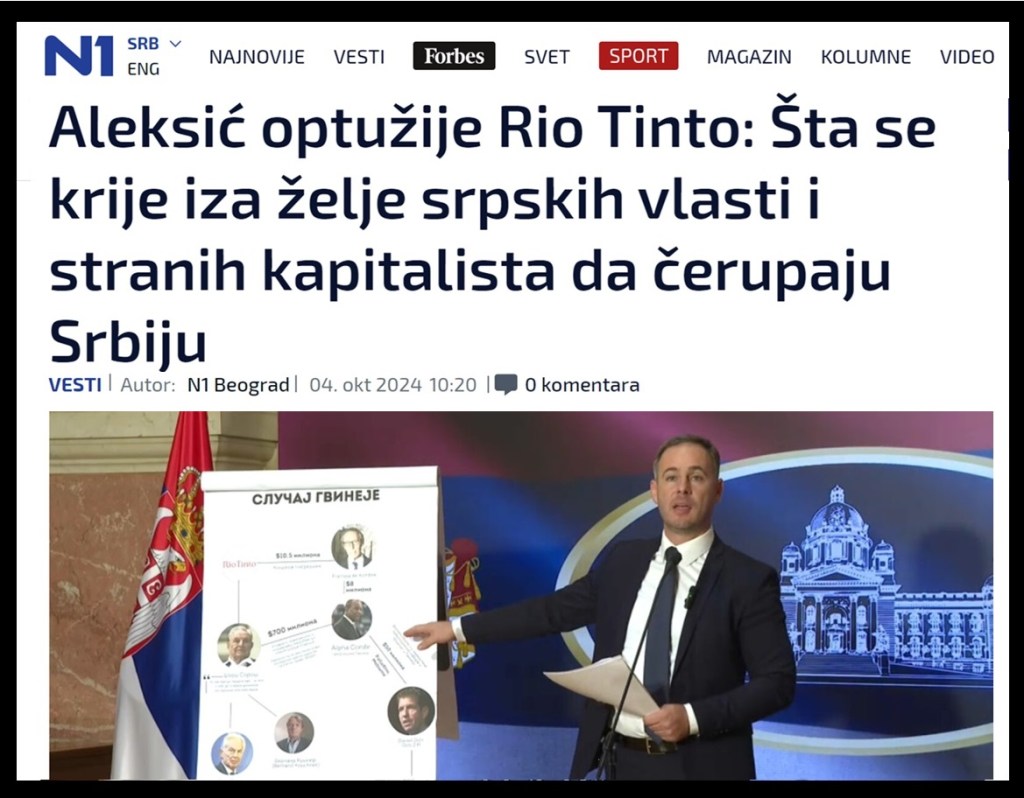 Zbog čega svi oni danas napadaju Rio Tinto, kad su bili glavni lobisti te kompanije? Da li su primali pare od Rio Tinta, da li su ucenjvali Rio Tinto, i iznuđivali novac, teško je odgonetnuti? Zbog čega se Miroslav Aleksić nije na konferenciji za medije pohvalio činjenicom da je doveo Rio Tinto, da je bio lobista Rio Tinta 17 godina, da je 17 godina podržavao iskopavanje litijuma i da je njegova bivša stranka G17(URS) dala sve dozvole Rio Tintu. Zbog čega se Miroslav Aleksić nije pohvalio da je od 2012. do 2016. voleo i podržavao predsednika Vučića i da je 4 godine bio u Trsteniku u koaliciji sa SNS?