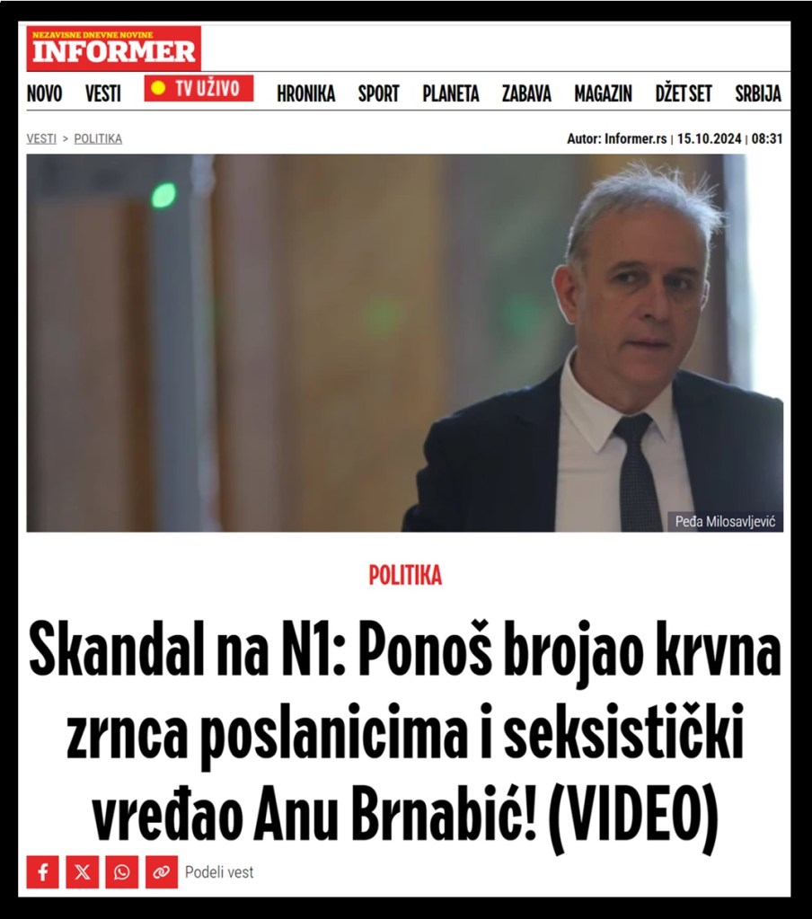 Juče 14.10.2024. je bivši, a ražalovani hrvatski NATO general Zdravko Ponoš, imao napad mizoginije, seksizma i šovinizma, u emisiji na TV N1. Hrvatski državljanin Zdravko Ponoš se usudio da seksistički i mizogino vređa Anu Brnabić, gde je rekao „Reprezent te vrhuške je već pomenuta Ana Brnabić. Ona kao da se takmiči sa svojim kolegama iz SNS-a. Oni misle da se Srbin postaje tako što sočno psuješ. To što gospođa Brnabić olako poteže reč rat, pa mogla je i ona da učestvuje u ratu, ako već ima potrebu da se dokaže svojom muškošću, i 1999. godine, imala je dovoljno godina“. Ponoš je u istoj emisiji, kao stručnjak za etničko čišćenje, i meni prebrojavao krvna zrnca i osporavao mi pravo da budem pripadnik srpskog naroda!?!