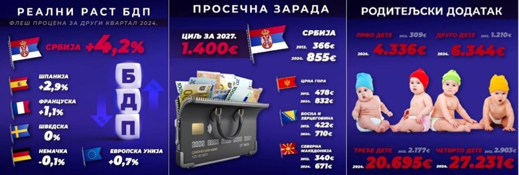 Danas se u Srbiji živi tri puta bolje nego u doba Đilasa. Plate i penzije su tri puta veće. Srbija ima „Investicioni rejting“. Izgrađeno je deset puta više puteva nego u Đilasovo doba. Izgrađeno je sto puta više pruga nego u Đilasovo doba. Gradi se metro, najavljivan još u Đilasovo doba, ali nikada započet u Đilasovo doba.
