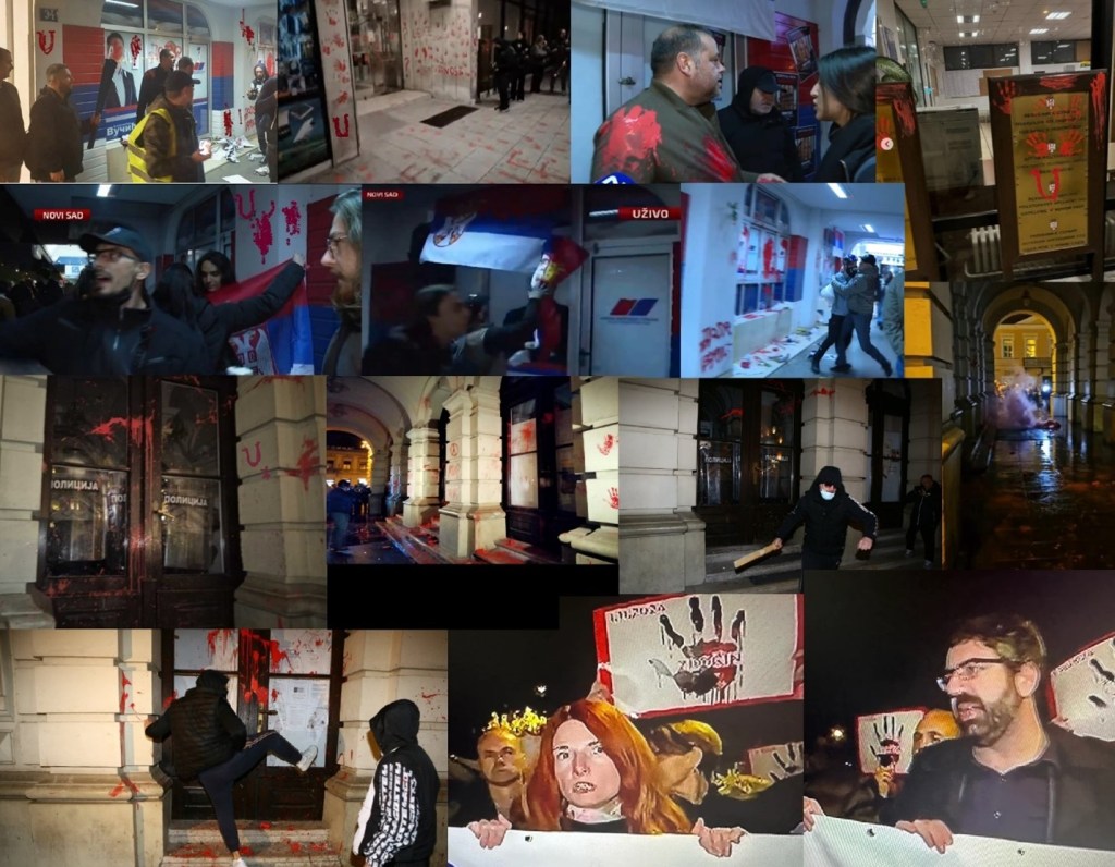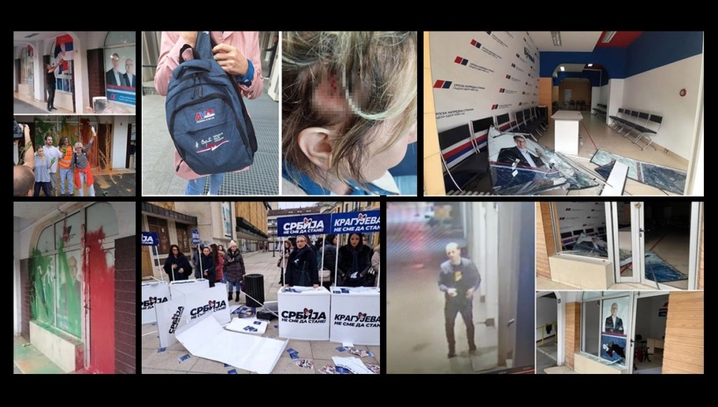 3.11.2024. Novi Sad, razbijene prostorije SNS na Podbari. 3.11.2024. Novi Sad, razbijene prostorije SNS na Bulevaru oslobođenja. 3.11.2024. Beograd, razbijene prostorije SNS na Voždovcu. 4.11.2024. Užice, opozicija je fizički napala tri žene iz SNS, u Užicu, kod užičke deponije „Duboko“. Lakše su povređene Marija Preković (hematom na stomaku) – na sopstveni zahtev je otpuštena sa bolničkog lečenja. Direktorki Regionalnog centra ‘Duboko’ Tanji Knežević povređeno je rame. Istovremeno je napadnuta i gradonačelnica Užica dr. Jelena Raković Radivojević, ali je ona prošla bez povreda. 5.11.2024. Novi Sad, razbijene prostorije SNS na Petrovaradinu, Veterniku, u Stražilovskoj, Kosovskoj i Rumenačkoj ulici. 5.11.2024. Novi Sad, opet su razbijene prostorije SNS na Bulevaru oslobođenja, tokom protesta opozicije. 5.11.2024. Beograd, razbijene prostorije SNS na Novom Beogradu. 5.11.2024. Beograd, razbijene prostorije SNS na Zvezdari, u Malom Mokrom Lugu. 10.11.2024. Kragujevac, razbijene prostorije SNS u Kragujevcu.