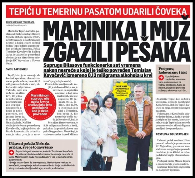 Marinika Tepić halucinira o nekakvoj odgovornosti i krivici predsednika Vučića za navodnu eksploziju kriminala u Vojvodini i Novom Sadu. Umesto tih frustriranih halucinacija, bilo bi dobro da nam gospođa Tepić saopšti istinu o svojoj odgovornosti i krivici u slučaju saobraćajne nesreće koju su izazvali ona i njen suprug. Taj udes se dogodio oko 17.30, u Novosadskoj ulici u Temerinu, kod broja 8. Mediji su izvestili da je gđa Tepić učestvovala u saobraćajnoj nesreći u kojoj je njen pijani suprug udario automobilom pešaka u Temerinu. Pešak Tomislav Kovačević iz Bačkog Jarka je tada teško povređen. Žrtva Tomislav Kovačević, je vozilom Hitne pomoći odmah prevezen na KC Vojvodine, gde su mu konstatovane mnogobrojne teške telesne povrede i zadržan je na klinici za ortopedsku hirurgiju i traumatologiju. Suprug gospođe Tepić je na merenju alko-test aparatom, oko sat vremena posle udesa, imao 0,13 miligrama alkohola u krvi. Neko je isposlovao da se suprugu gospođe Tepić ne radi analiza krvi, što je inače uobičajena procedura kad god je u pitanju nesreća u kojoj je neko povređen. U policijskom zapisniku konstatovano je da su uslovi za vožnju bili idealni. Kako se navodi, put je bio prav, bez suženja, a kolovoz suv i čist. Folksvagen pasat supruga gđe Tepić, je Kovačevića udario levim delom, a kada je policija stigla na lice mesta, konstatovala je da je suprug gđe Tepić nakon nesreće pomerao vozilo, što je nedozvoljeno. Postojala je osnovana sumnja da je trezna gospođa Tepić vozila kola, ali da je njen suprug odlučio da preuzme krivicu, iako je pio alkohol. Bilo bi dobro da se gospođa Tepić, prvi put oglasi o ovim istinama, i preuzme odgovornost.