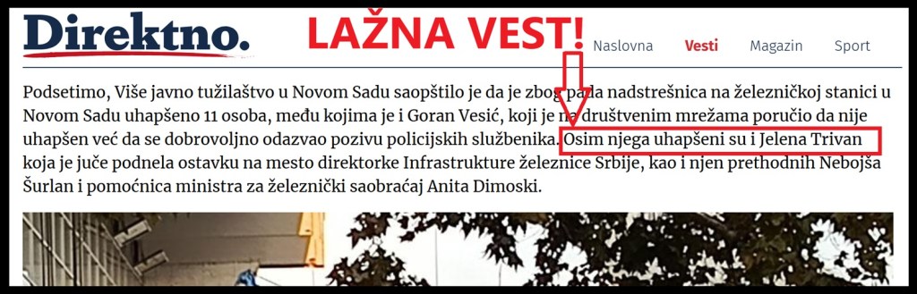 Takođe, „Direktno“ u tekstu iznosi lažnu vest da je uhapšena Jelena Trivan. U tekstu „Direktno“ stoji: „u Novom Sadu uhapšeno 11 osoba, među kojima je i Goran Vesić (…) Osim njega uhapšeni su i Jelena Trivan…“.
