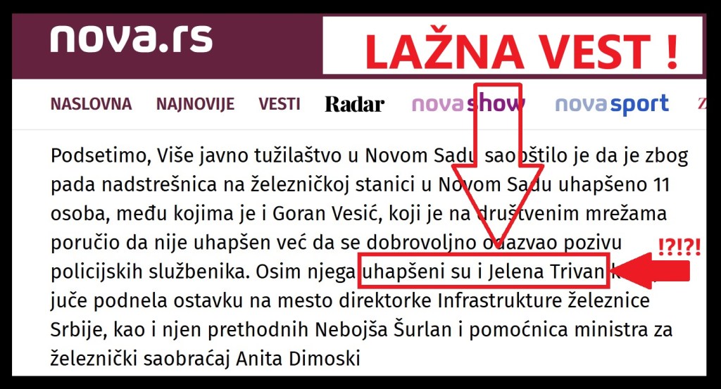 Takođe, „NovaS“ u tekstu iznosi lažnu vest da je uhapšena Jelena Trivan. U tekstu „NoveS“ stoji: „u Novom Sadu uhapšeno 11 osoba, među kojima je i Goran Vesić (…) Osim njega uhapšeni su i Jelena Trivan…“.