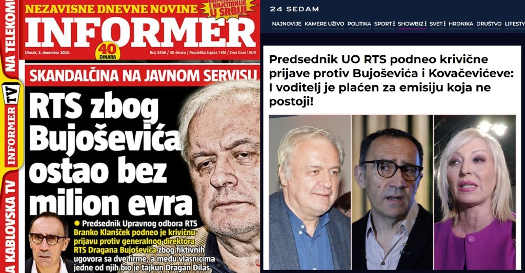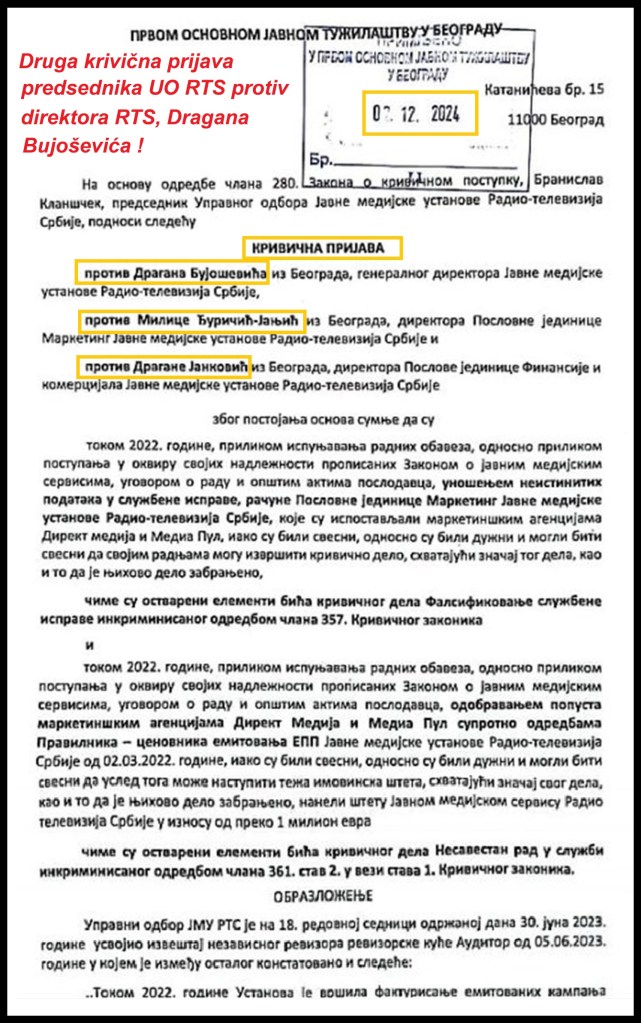 Saopštenje za javnost predsednik UO RTS, Branka Klanščeka, ekskluzivno je preneo „Informer“: „Vršeći dužnost predsednika UO RTS-a u skladu sa Zakonom o javnim medijskim servisima i Statuta RTS-a, zbog uočenih nepravilnosti u poslovanju i kršenja internih akata RTS-a, podneo sam danas krivičnu prijavu protiv generalnog direktora RTS-a Dragana Bujoševića, direktorke PJ Marketing Milice Đuričić Janjić i direktorke PJ Finansije i komercijala Dragane Janković, a zbog osnovane sumnje da su počinili krivično delo Falsifikovanje službene isprave iz člana 357 KZ i Nesavestan rad u službi iz člana 361 KZ pri čemu je po RTS nastupila šteta od preko milion evra. Naime, u izveštaju nezavisnog revizora revizorske kuće Auditor od 05.06.2023. godine konstatovano je sledeće: ,,Tokom 2022. godine Ustanova je vršila fakturisanje emitovanih kampanja marketinškim agencijama ,,Direct Media’’ doo Beograd i ,,Media Pool’’ doo Beograd pozivajući se na ugovore koji ne postoje’’. U cilju provere činjenica utvrđenih u navedenom izveštaju, postupajući u okviru svojih nadležnosti, uvidom u fakture za plaćanje usluga oglašavanja, koje je RTS izdao marketinškim agencijama Direkt Medija i Medija Pul, u ukupnom iznosu od skoro 9 miliona evra, ustanovio sam da sve fakture u koje sam imao uvid kao osnov plaćanja imaju ugovor zaveden pod brojem R-0441 od 02.03.2022. godine za Direkt medija i R-0443 od 02.03.2022 za Medija pul. Međutim, proverom u službi Pisarnice i arhive utvrdio sam da pod tim brojevima navedeni ugovori ne postoje. Takođe sam utvrdio da je u svakoj fakturi u koju sam imao uvid odobren agencijski ili količinski popust a u mnogim i agencijski i količinski, a što je u suprotnosti sa Cenovnikom emitovanja EPP kojim je propisano da oglašivači mogu ostvariti agencijski i količinski popust od 10% i više, na osnovu zaključenog, odnosno potpisanog godišnjeg ugovora o oglašavanju sa JMU RTS. Imajući u vidu da pomenuti ugovori ne postoje, odnosno da RTS nije potpisao godišnji ugovor za 2022. godinu sa marketinškim agencijama Direkt medija i Medija pul, kojima bi definisao popuste, već da su brojevi ugovora uneti u fakture fiktivni, a popusti stvarni, jasno je da je RTS prihodovao manje za iznos odobrenih popusta, što dovodi do sumnje da je oštećen za više od milion evra. Pozivam nadležno tužilaštvo da reaguje brzo i odgovorno. Javnost ima pravo da zna istinu, a Javni servis mora biti primer transparentnosti i zakonitog poslovanja. Odgovornost je obaveza svih nas“.
