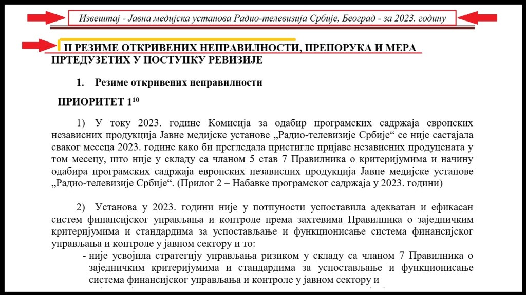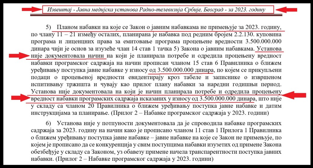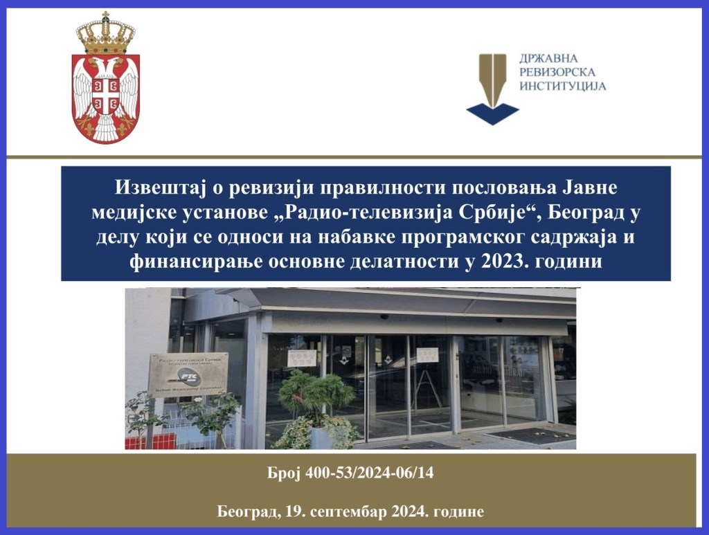 Državna revizorska institucija (DRI) je u svom „Izveštaju o reviziji pravilnosti poslovanja Javne medijske ustanove „Radio-televizija Srbije“, Beograd u delu koji se odnosi na nabavke programskog sadržaja i finansiranje osnovne delatnosti u 2023. godini“, Broj 400-53/2024-06/14, od 19.9.2024. godine, ustanovila da je RTS nepropisno potrošio 30 miliona evra na spoljne produkcije. DRI je utvrdila da je rukovodstvo RTS tokom 2013. godine nepropisno i netransparentno dalo 3,5 milijarde dinara (oko 30 miliona evra) za kupovinu programa od spoljnih produkcija. Javna je tajna da RTS angažuje spoljne produkcije za proizvodnju programa i te produkcije potom koriste opremu i radnike javnog servisa za snimanje emisija. DRI je proveravala nabavku programskih sadržaja i otkrila niz nepravilnosti. Rukovodstvo RTS-a je od DRI prikrilo način i kriterijume po kojima su planirali i procenjivali vrednost programskih sadržaja. „Ustanova nije dokumentovala na koji je način planirala potrebe i odredila procenjenu vrednost nabavki programskih sadržaja iskazanih u iznosu od 3.500.000.000 dinara, što nije u skladu sa članom 20 Pravilnika o bližem uređivanju postupka javne nabavke i datim instrukcijama za planiranje”, navodi se u izveštaju DRI. Navedeno je da je rukovodstvo RTS preraspodelilo oko 773 miliona dinara na programske sadržaje koji nisu bili obuhvaćeni finansijskim planom koji je Upravni odbor odobrio. „Prema objašnjenju koje nam je dostavljeno od rukovodstva Ustanove, nabavke programskog sadržaja mogu da se sprovode samo sa određenim privrednim subjektima, koji jedini mogu da izvrše nabavku programskog sadržaja, a koji predstavlja stvaranje ili kupovinu jedinstvenog dela ili umetničkog izvođenja, ili se radi o nepostojanju konkurencije iz tehničkih razloga ili zbog zaštite ekskluzivnih prava, uključujući prava intelektualne svojine, tako da se na ovakve nabavke ne mogu primeniti sve odredbe Priloga 1 Pravilnika o bližem uređenju postupka javne nabavke (pribavljanje tri ponude, zahtev za nabavku, ocena najpovoljnije ponude)” stoji u izveštaju DRI. I pored više krivičnih prijava protiv rukovodstva RTS, i pored izveštaja DRI, postupanje tužilaštva je i dalje u predistražnoj fazi, iako je predsednik UO RTS, prvu krivičnu prijavu podneo još u februaru 2023. godine.