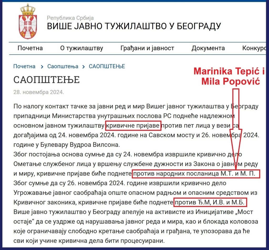 Istina je sledeća. Više javno tužilaštvo u Beogradu podnelo je krivične prijave protiv pet lica (uključujući Đilasove poslanice Mariniku Tepić i Milu Popović) u vezi sa događajima od 24.11.2024. na Savskom mostu i 27.11.2024. u Bulevaru Vudroa Vilsona. Zbog postojanja osnova sumnje da su 24.11. izvršile krivično delo Ometanje službenog lica u vršenju službene dužnosti krivične prijave su podnete protiv narodnih poslanica Marinike Tepić i Mile Popović. Zbog sumnje da su 27.11. izvršili krivično delo Ugrožavanje javnog saobraćaja opšte opasnom radnjom i opasnim sredstvom, krivične prijave su podnete protiv Đorđa Miketića, Ilije Vučevića i Marina Bodrožića. Đilas je kukavica. Đilas uvek podmeće druge, da umesto njega obavljaju prljave poslove, a štiti sebe. Do sada je hapšeno 50 njegovih saradnika, ali ne i Đilas. Umesto Đilasa, žene štrajkuju glađu, jadnici nasrću na policiju, pale Gradsku kuću u Novom Sadu, pale Skupštinu itd. Marinika Tepić i Mila Popović po nalogu Đilasa, vrše krivična dela, ali Đilas ne. Onda Marinika Tepić i Mila Popović „popiju“ krivičnu prijavu, a Đilas ne. Kukavica.