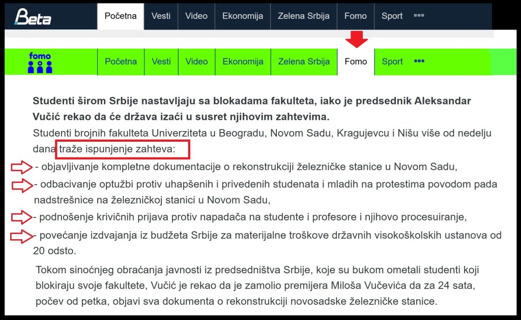 Studenti koji blokiraju fakultete su imali 4 zahteva, kako je 12.12.2024. godine, javila opoziciona Agencija „Beta“. U toj vesti stoji šta su zahtevi studenata: