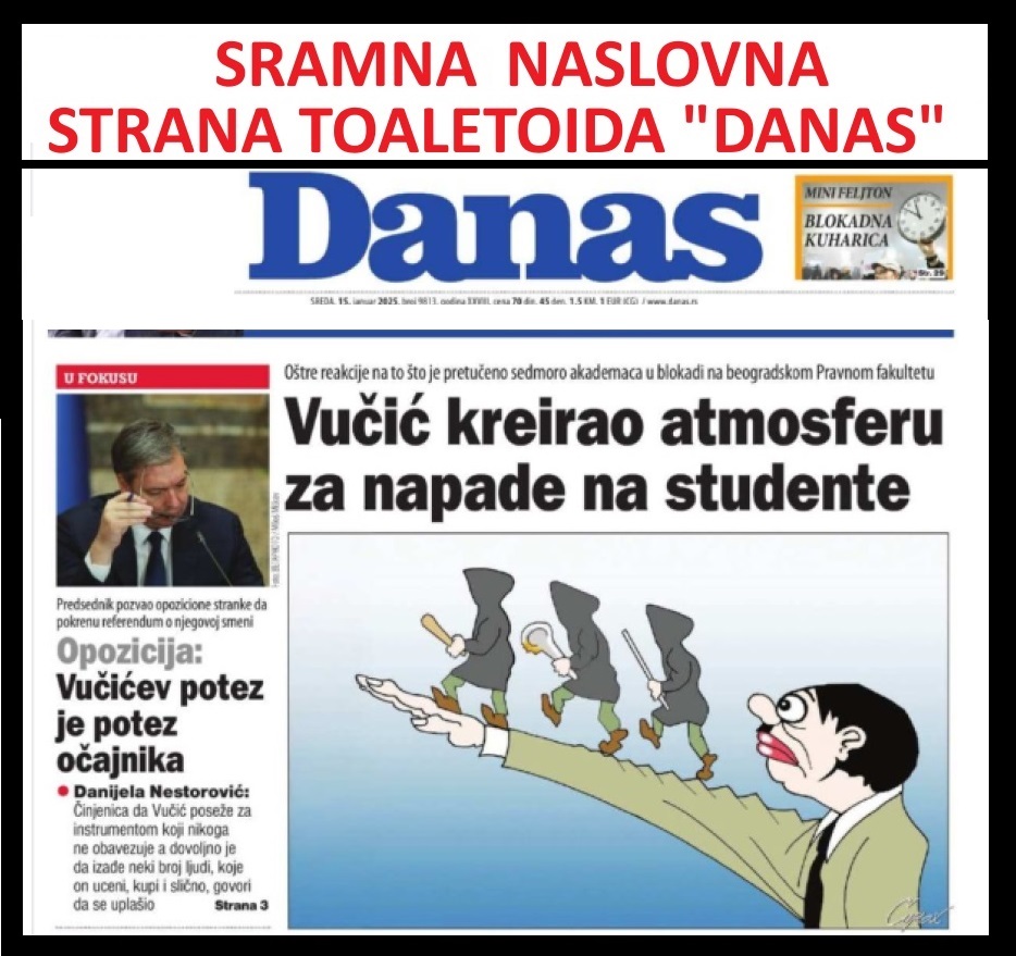Tome služe i laži opozicije i „Danasa“ da iza tuče studenata na Pravnom fakultetu stoji vlast. Istina je da su se pijani studenti u blokadi, posvađali i potukli između sebe! Nije to prvi put. Setimo se kako je Mila Pajić „liderka“ studenata, krvnički tukla svog dečka Branislava Đorđevića. Setimo se svih svađa studenata. Setimo se hrvatskih obaveštajaca na fakultetima. Setimo se alkohola i droge na fakultetima, koji su pretvoreni u Đilasov svinjac, tačnije, Đilasovu „Kuću Velikog Brata“. Za sve to nije kriv Vučić, nego partijski studenti i opozicija kojoj pripadaju!