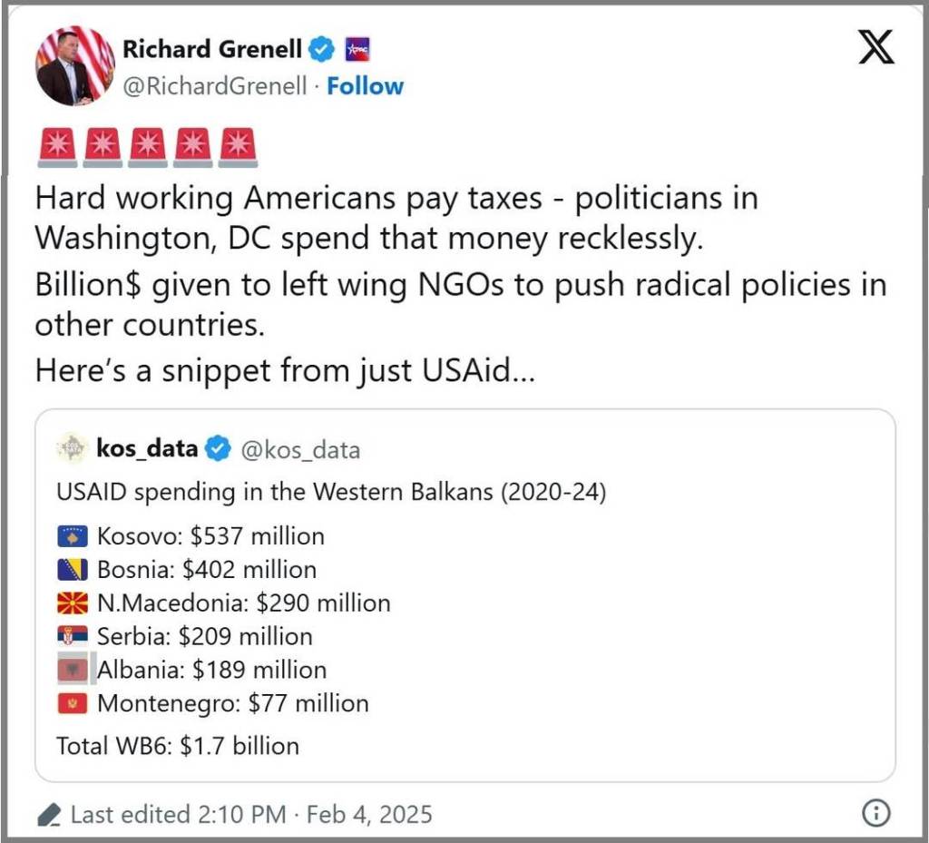 Kada govorimo o novcu koji je uložen u rušenje Vučiča, evo najupečatljivijeg dokaza. Ričard Grenel, zvaničnik SAD, je 4.2.2025. rekao: „Vredni Amerikanci plaćaju porez, a političari u Vašingtonu nesmotreno troše taj novac. Milijardu dolara dato je levičarskim nevladinim organizacijama za sprovođenje radikalne politike u drugim zemljama. Evo isečka samo iz USAID“. Grenel je govorio o delu novca koji je uložen protiv Srbije i Vučića. Grenel je rekao, citiram: „USAID je na Zapadnom Balkanu potrošio – na Kosovu 537 miliona dolara, u Bosni 402 miliona, u Srbiji 209 miliona dolara, u Albaniji 189 miliona, i u Crnoj Gori 77 miliona dolara. Ukupno 1,7 milijardi dolara od 2020. do 2024. godine“. Kraj citata. Toliko novca je samo Bajdenov USAID uložio protiv Srbije i Vučića. A ulagali su i NED, Stejt dipartment, desetine vladinih organizacija iz Evrope, i stotine privatnih fondacija iz SAD i Evrope. Radi se o milijardama dolara ili evra, za 5 godina, koje su uložene u rušenje Vučića i u destabilizaciju Srbije.