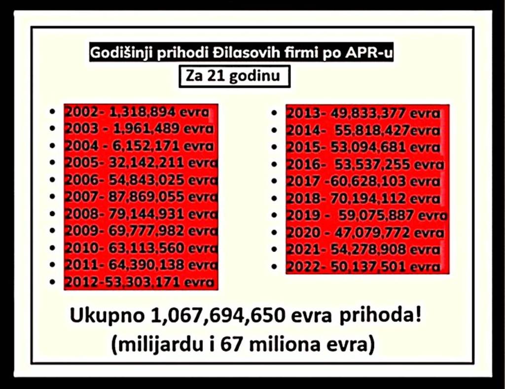Dragan Đilas je postao član DS 2004. godine i od tada su se prihodi njegovih firmi ustostručili. Sumnja se da se Đilas obogatio, putem zloupotrebe službenog položaja, trgovine uticajem i vršenjem drugih krivičnih dela. Đilas je od 2004. do 2013. obavljao 3 državne funkcije: Direktor Narodne kancelarije bivšeg predsednika Borisa Tadića, ministar za NIP i gradonačelnik Beograda. U periodu od 2004. do 2013. godine Đilasove kompanije su zaradile 619 miliona evra. Prihodi 11 firmi Dragana Đilasa, koje je lično prijavio APR-u, za 21 godinu (od 2002. do 2022.) iznosili su milijardu i 67 miliona evra (1.067.000.000 evra). Verica Barać, nekadašnja predsednica Saveta za borbu protiv korupcije, je 2011. godine, ovako govorila o korupciji vlasti Demokratske stranke i njenih čelnika: „Ovde je dozvoljeno da gradonačelnik (Đilas – op.aut.) ima privatne firme koje se bave ovim medijima. Nema tu mnogo, njih nekoliko, koji između sebe naravno neće dati podatke, jer su svi u tom krugu. Ovo je tačno za Đilasa, Šapera, A media koja je vezana za G17plus, i prema tome šta su radili. Tu je dolazio njihov čovek, koji se ljutio na to. Mi smo ga pitali „Jesu li podaci tačni, jel ti tačno da ste sve ove usluge davali svim ovim institucijama gde je zaista g17 postavio direktora? Jel to tačan podatak? – Jeste, ali to nije ništa naš prihod. Mi se nismo bavili vašim prihodom, mi smo se bavili kako država preko ovih agencija utiče na medije. Kada ih pitate jesu li podaci tačni, oni kažu da jesu, ali to nema veze. Naprotiv ima veoma veze, jer to ne bi bio Šaper, Đilas i agencija za Dinkića da nema veze. Pitali bi kakvo bi bilo njegovo mesto na tržištu da nisu vezani za Tadića i DS. i još najgore, vezani su za budžet. i to tvrditi da to nema veze, nego su to prosto to tako pametni i kreativni ljudi koji okreću toliki novac. To je bezobrazluk i cinizam. Stalno posluju sa budžetom, toliko su sposobni na tržištu da stalno posluju sa budžetom“.