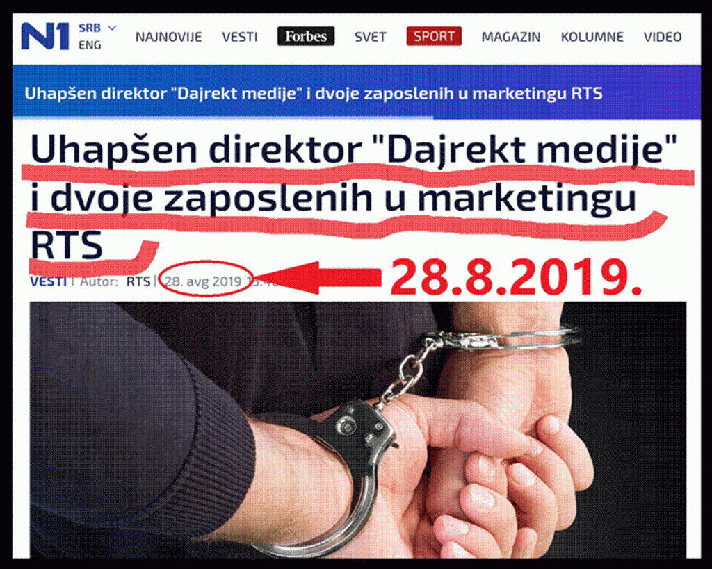 Istraga iz 2019. godine! U julu 2019. godine, ministar policije je potvrdio da se protiv Dragana Đilasa i drugih lica, vodi istraga zbog sumnje da su umešani u pljačku RTS. Ministar Nebojša Stefanović je 07.07.2019. izjavio da tužilaštvo i policija istražuju osnove sumnje da su Dragan Đilas i njegovi zaposleni sa bivšim rukovodstvom RTS-a učestovali u korupciji u vezi kupoprodaje TV sekundi. „Postoji osnovana sumnja da su Đilas i njegovi zaposleni i to neki od najviše rangiranih u njegovoj kompaniji zajedno sa tadašnjim delom rukovodstva RTS učestvovali u ozbiljnoj korupciji vezano za kupovinu i prodaju sekundi različitih televizijskih emisija po uslovima koji nisu bili predviđeni zakonom“ rekao je ministar policije. Direktor Dajrekt medije Jovan Stojanović i dvoje zaposlenih Radio televizije Srbije, Milica Đuričić Janjić, direktorka službe marketinga RTS-a Mirjana Katanić, šefica u službi marketinga javnog servisa, uhapšeni su 28.08.2019. potvrdilo je tada Tužilaštvo za organizovani kriminal. Jovan Stojanović, Milica Đuričić Janjić i Mirjana Katanić, su privedeni na osnovu sumnji da su zloupotrebili položaj odgovornog lica (čl. 227. stav 3 u vezi stava 1, a sve u vezi čl. 33 i 35 KZ). Za isto delo sumnjičila se još i Jadranka Drinić, bivša direktorka u „Dajrekt mediji“, koja je van zemlje (u Italiji) i za kojom je raspisana potraga. Jadranka Drinić je do dana današnjeg ostala nedostupna nadležnim organima. Ministar policije Nebojša Stefanović potvrdio je tada da je policija po nalogu Tužilaštva za organizovani kriminal uhapsila tri navedene osobe zbog sumnje da su zloupotrebom položaja u „Dajrekt mediji“ i RTS-u oštetili javni servis za ukupno 688 miliona dinara. Stefanović je na vanrednoj konferenciji za medije rekao da su te osobe osumnjičene da su krivična dela izvršile od avgusta 2009. do 2018. godine. Ministar unutrašnjih poslova Nebojša Stefanović izjavio je da se sprovodi velika istraga tužilaštva i policije jer postoje osnovi sumnje da su Dragan Đilas i zaposleni u njegovoj kompaniji zajedno sa delom nekadašneg rukovodstva RTS-a učestvovali u ozbiljnoj korupciji za kupoprodaju sekundi različitih TV emisija protivno zakonu. „Postoji osnovana sumnja da su Đilas i njegovi zaposleni i to neki od najviše rangiranih u njegovoj kompaniji zajedno sa tadašnjim delom rukovodstva RTS učestvovali u ozbiljnoj korupciji vezano za kupovinu i prodaju sekundi različitih televizijskih emisija po uslovima koji nisu bili predviđeni zakonom“, rekao je ministar.