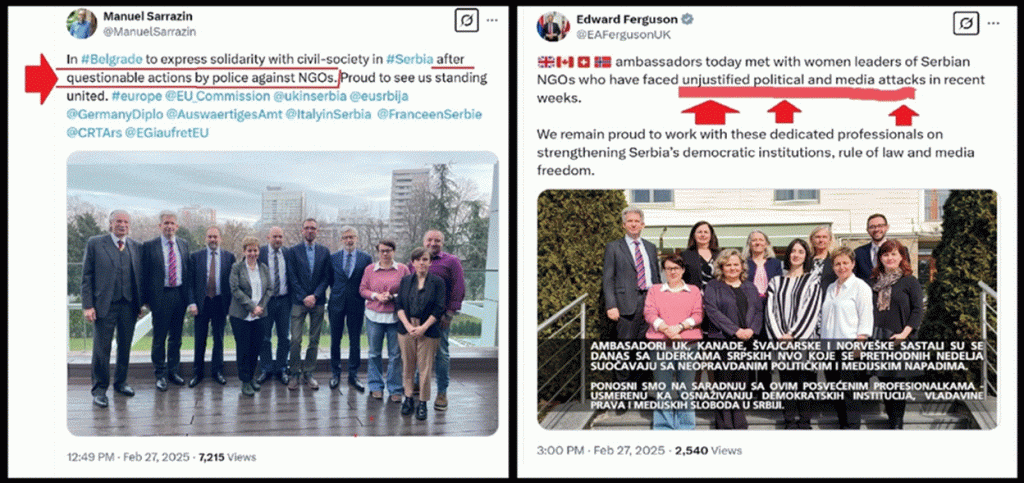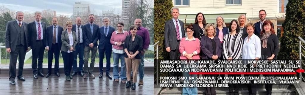 Danas, 27.02.2024. godine, pripadnici više antisrpskih nevladinih organizacija – CRTA, Građanske inicijative, Fondacija Trag itd., su se na više sastanaka, sreli sa stranim ambasadorima ili specijalnim predstavnicima – Evropske unije, Velike Britanije, Nemačke, Kanade, Švajcarske, Norveške, Francuske i Italije. Predstavnici NVO su došli kod svojih gazda i finansijera, i zakukali da ih spasu. Gazde su se isprsile i rekle – slikaćemo se zajedno, i objavićemo to na platformi „X“- a vi nastavite sa radom. Pare koje ste dobijali od USAID, ćemo vam mi nadoknaditi.