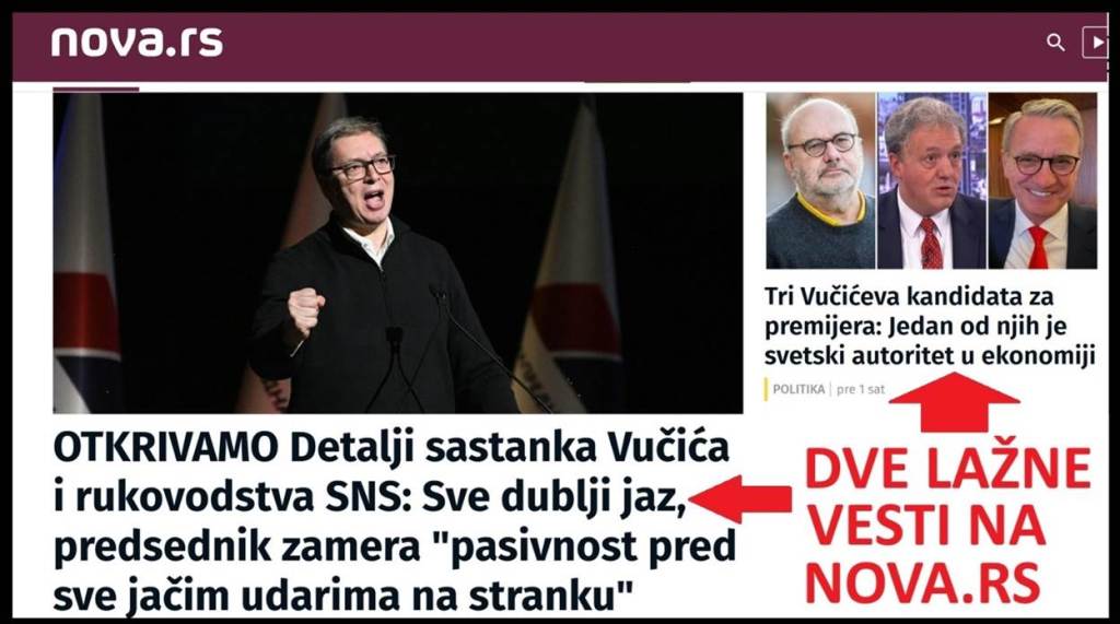 Portal TV NovaS, „NOVA.RS“ je 24.3.2025. objavio još jednu lažnu vest, pod naslovom: „OTKRIVAMO Detalji sastanka Vučića i rukovodstva SNS: Sve dublji jaz, predsednik zamera „pasivnost pred sve jačim udarima na stranku“. U toj lažnoj vesti, između ostalog stoji: „Prethodne nedelje održan je sastanak rukovodstva Srpske napredne stranke na kom je, kako saznaje portal Nova.rs, predsednik Srbije Aleksandar Vučić i najuticajniji član ove partije kritikovao vrh stranke zbog, kako navode naši izvori, „pasivnosti u trenucima kad SNS trpi najjače udare od dolaska na vlast“. Autor teksta je zloglasni Vojislav Milovančević. Prvi dokaz da je vest lažna je to što se ne imenuje se bilo kakav izvor, već se navodi beznačajno i neprofesionalno „navode naši izvori“, što je sinonim za – nemamo izvor, pa izmišljamo! Drugo, sve u tom tekstu je laž, sve je izmislio Vojislav Milovančević. Ne postoji izvor te vesti. Najvažnije, taj sastanak se uopšte nije dogodio!