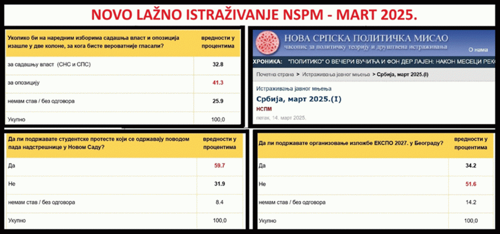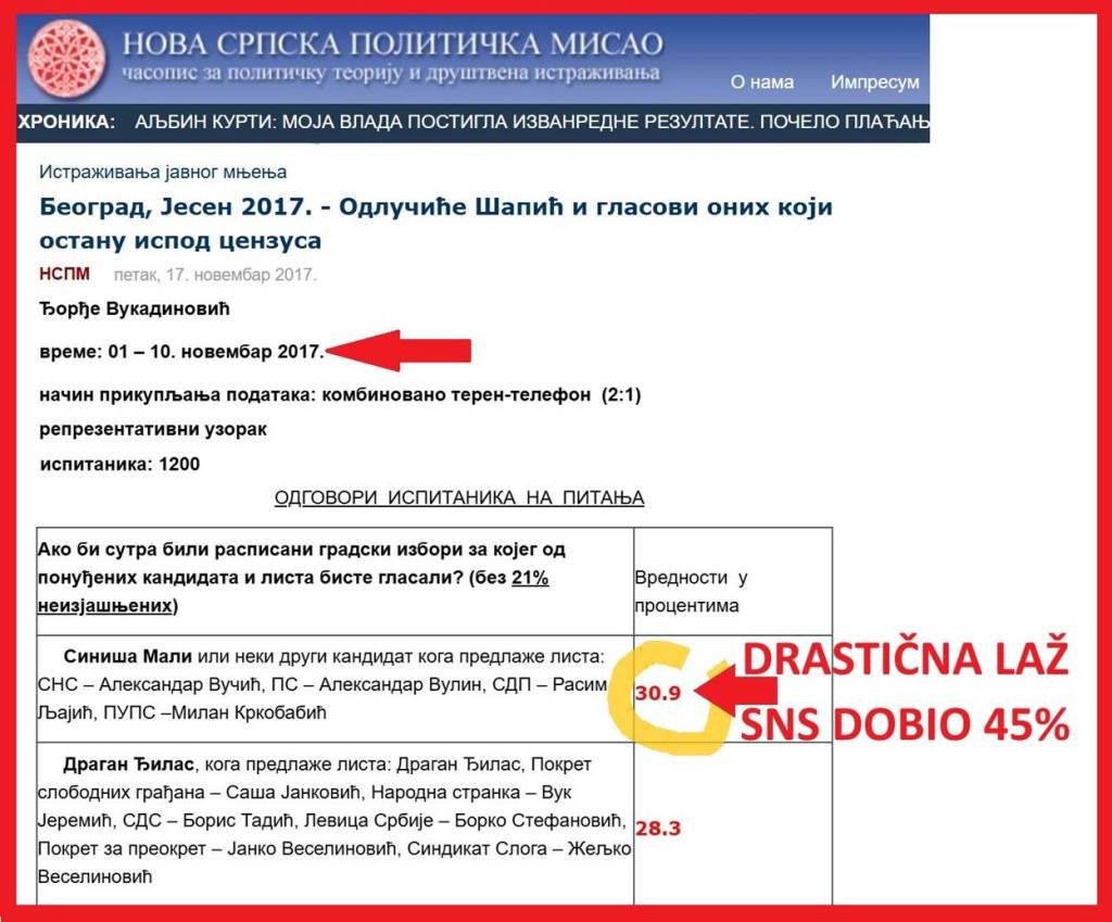 Da zaključim. Đilasovi i Šolakovi mediji su slabo i stidljivo prikazali „istraživanje“ Vukadinovića i NSPM. To istraživanje je objavljeno pre dve nedelje na sajtu NSPM, ali nikoga nije zanimalo. Razlog je to što već i vrapci na grani znaju da Vukadinović isključivo izmišlja i frizira istraživanja, tj. da uopšte ne istražuje javno mnjenje, već da prikazuje ono što mu Đilas naloži i plati. Pametnom dosta!