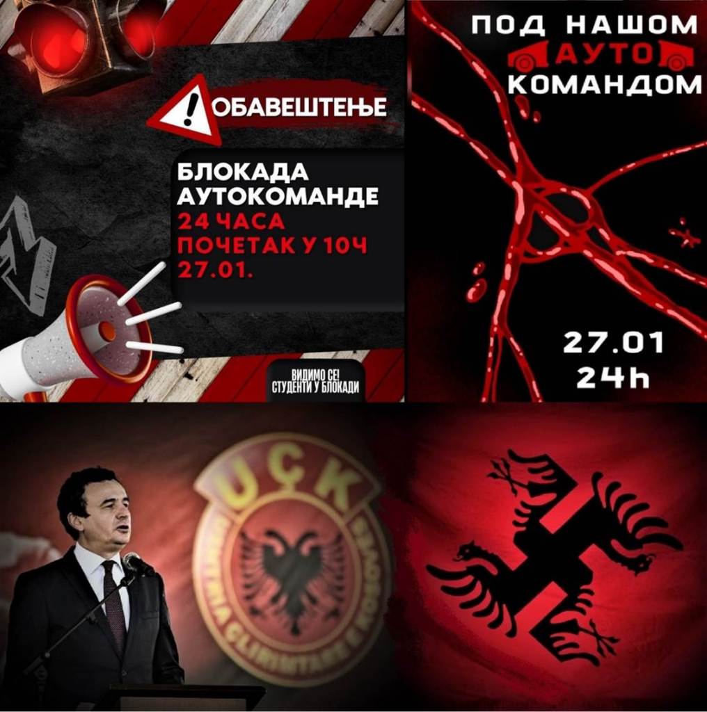 27.1.2025. Beograd. Dvadesetčetvoročasovna blokada Autokomande, jedne od najvećih saobraćajnica u Beogradu, završena je u utorak, 28. januara. Na nju su pozvali studenti, a skup nazvali „Pod našom (Auto)komandom“. Reklama za ovo nasilje je bila mapa Autokomande, kroz koje teku reke krvi!