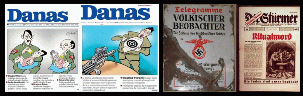 Svi ti nacistički mediji su radili isto što danas rade Šolakovi, opozicioni mediji N1, NovaS, Danas i drugi. Nacistički mediji su širili nehumane pozive na nasilje prema Jevrejima, Romima i Slovenima, a kasnije su pripremali teren i pozivali na eliminaciju Jevreja, Roma i Slovena. U suštini, nacistička glasila su pre početka genocida, služila za pripremu terena, za pripremu nemačke javnosti da prihvati nacistički stav da su Jevreji, Romi i Sloveni, neinteligentna bića malih mozgova, bahati, zli, alavi i pakosni, i kako ih treba eliminisati. Baš ovako je o pripadnicima SNS, govorio Draža Petrović, glodur lista „Danas“, u svojoj kolumni. Kada je genocid nad Jevrejima, Romima i Slovenima počeo, Hitlerova dva glasila „Folkišer beobahter“ i „Šturmer“, su služila da opravdaju genocid. Nacisti su od 1933. do 1945. razvili i u svojim medijima propagirali teoriju o „nadljudima“ („Übermensch“) i podljudima („Untermensch“). Za podljude su proglasili Jevreje, Rome i Slovene. Suština te nacističke teorije je bila u tome da su „podljudi“, neinteligentni, da imaju manje mozgove nego „nadljudi“, da imaju manjak moždane materije, da šire bolesti, da su krezubi, ružni, prljavi, bahati, zli, alavi i pakosni, i da zbog toga „nadljudi“ imaju pravo da ih eliminišu. Sve ovo rade i Šolakovi mediji, a na ulicama sprovode opozicioni fašisti.