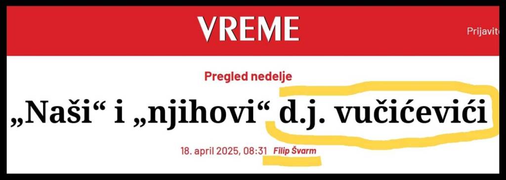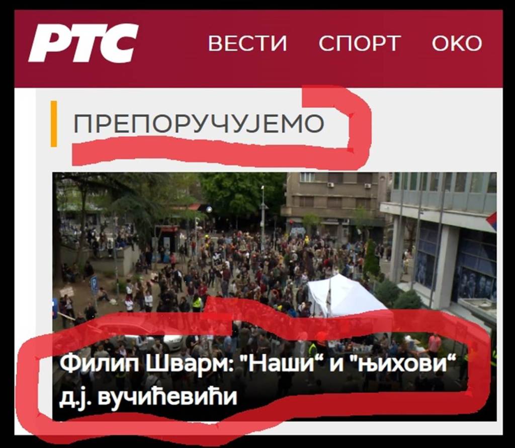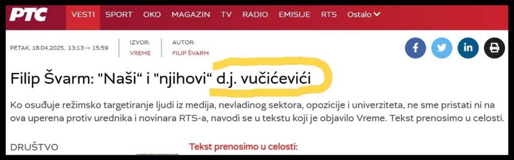 Najoštrije osuđujem bezumni teror nad RTS-om i nad zaposlenima u RTS-u. List „Vreme“ je objavio sramni tekst svog novinara Filipa Švarma, pod nazivom: „„Naši“ i „njihovi““ d.j. vučićevići“. Isti sramni tekst je obavio i portal RTS-a, u rubrici „Preporučujemo“. U samom naslovu teksta, koji navodno brani slobodno novinarstvo, Đilasov novinar Filip Švarm se podsmeva i satanizuje glavnog i odgovornog urednika lista „Informer“, Dragana J. Vučićevića, nazivajući ga „d.j. vučićević“. To je pakosna želja F. Švarma da omalovaži Dragana J. Vučićevića, da ga „umanji“, namerno pogrešno upotrebljavajući mala slova, tamo gde je mesto velikim. Tu metodu su već koristili nacisti i Gebels, od 1933. godine, kada su namerno pisali imena i prezimena Jevreja, malim slovima.