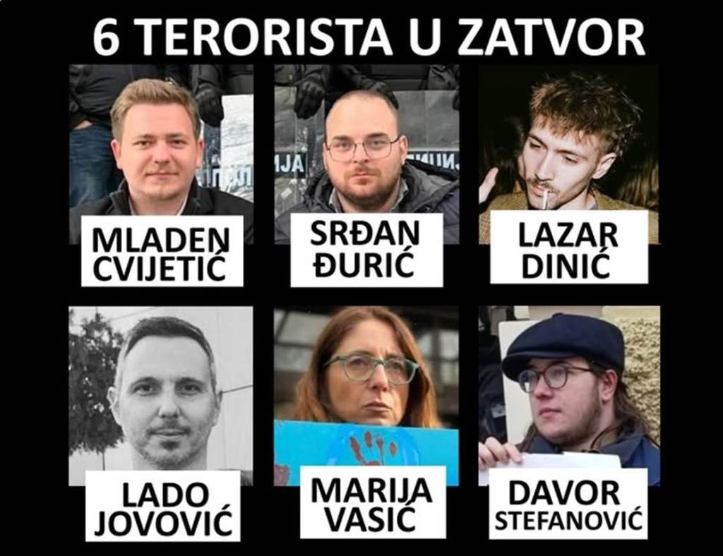 Teroristička opozicija je u proteklim danima napadala policiju i sudove u Novom Sadu i Nišu! Zbog čega? Zbog 6 terorista koji su u zatvoru i zbog 6 terorista koji su u bekstvu u Hrvatskoj! Opozicija je zahtevala da se teroristi odmah puste, da bi mogli da nastave da terorišu Srbiju! Apelacioni sud u NS je podlegao pritisku i pustio iz pritvora 6 terorista. Žute sudije, Đilasove i Marinikine sudije!