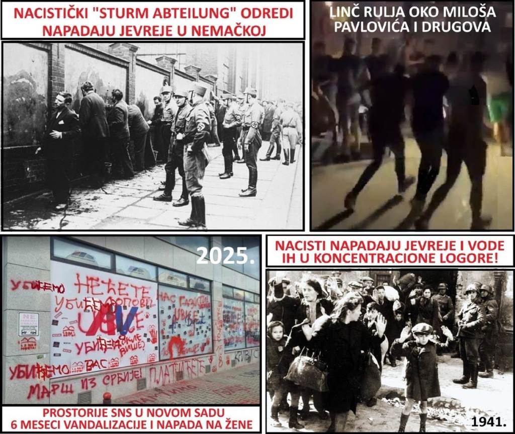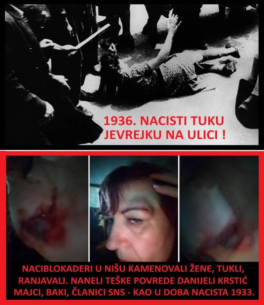 Vidimo da je postupanje blokadera u Srbiji, potpuno jednako postupanju nacista u Nemačkoj. Nacisti su tokom tridesetih, na ulaze u naseljena mesta kačili natpise „Jevreji nisu dobrodošli“. Jednako tako je jedna liderka studenata u aprilu mesecu, ispred stana postavila novi ručno pravljeni i naručeni otirač sa nacističkim natpisom „Ćaci nisu dobrodošli“. Ovaj poklič se redovno može čuti u Šolakovim medijima. Nacisti su namerno, da izazovu što veći efekat, na ulicama, javno tukli Jevrejke. Jednako tako su blokaderi nacisti u Nišu 21.3.2025. kamenovali mnoge žene iz SNS. Najteže povrede zadobila je Danijela Krstić, iz SNS koja je kamenovana, ranjena, dobila potres mozga i završila u bolnici. U istom incidentu povređeno je više desetina ljudi. Nacisti su napali su i ministarku Jelenu Žarić Kovačević, uništili policijsku stanicu i nastavili da divljaju tokom cele noći.