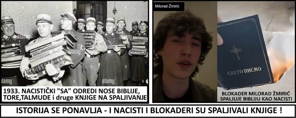 Takođe, naci blokaderi su pre nekoliko dana demonstrativno palili Bibliju i druge knjige, i upućivali uvrede i pretnje Srpskoj pravoslavnoj crkvi. Blokader student satanista, Milorad Žmirić, je sam dokumentovao i snimio svoje iživljavanje nad knjigama i Biblijom, i vređanje SPC. Žmirić je zapalio Bibliju i sve to snimio i okačio na svoj profil. Žmirić se predstavlja kao rodno fluidna osoba i rodno neutralna osoba!?! Jednako ovako, nacisti su masovno i javno spaljivali i Biblije, i Tore i Talmude, i sve ostale „proskribovane“ i „nepodobne“ knjige. Posle toga, nacisti su u krematorijumima koncentracionih logora u Nemačkoj spaljivali Jevreje, Ruse, Srbe, Rome itd. Od zabrane Jevrejima da studiraju, preko paljenja Biblija, nacisti su stigli do genocida i holokausta.