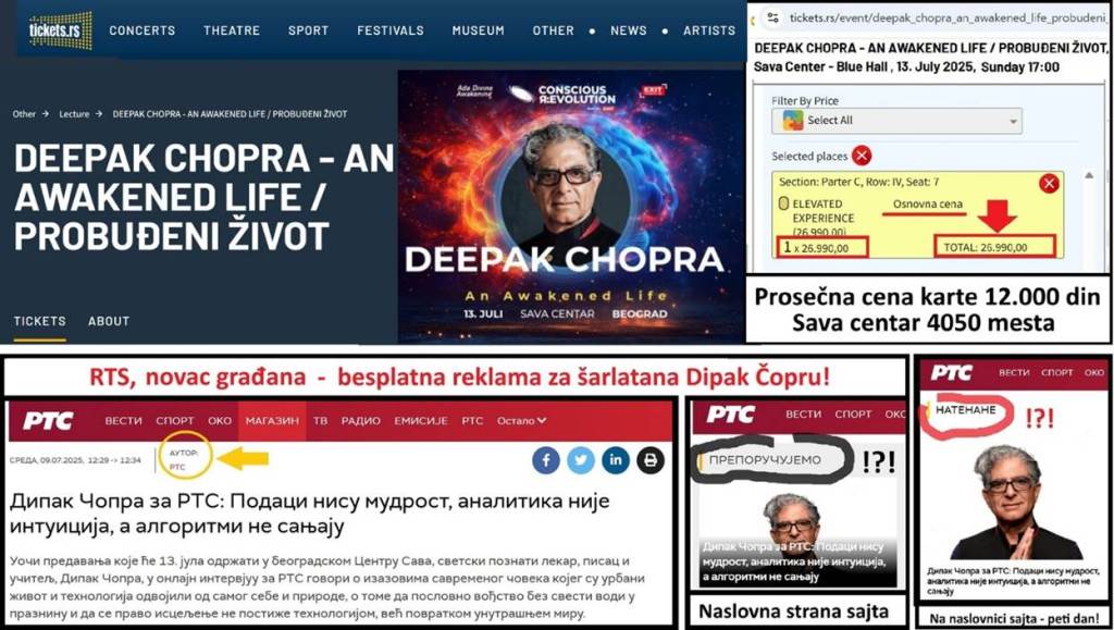 Lažni „Javni servis“, a stvarni privatni servis Đilasa, Bujoševića i Kovačevićke, nas je pre nekoliko dana opsenio glupošću i skarednošću više priloga o koncertu ustaše MP Tompsona. RTS je čak poslao i ekipu na koncert naciste Tompsona. Sramotan način da se troši novac građana koji finansiraju RTS. U svom zanosu nekontrolisanosti i neodgovornosti, RTS je 9.7.2025. na naslovnoj strani svog sajta, koji takođe plaćaju građani Srbije, objavio besplatnu reklamu megašarlatanu i prevarantu Dipak Čopri, u tekstu pod naslovom „Dipak Čopra za RTS: Podaci nisu mudrost, analitika nije intuicija, a algoritmi ne sanjaju“. Autor teksta – onlajn (!?!) intervjua je „RTS“!?! Problem je u tome što je Dipak Čopra dokazani šarlatan i prevarant, koji se neizmerno obogatio prodajom svojih proizvoda i knjiga i držanjem predavanja o „taštini praznine“- o „kvantnoj medicini“ koja nije nauka, već pseudo nauka, prevara koja služi da se šarlatani bogate zloupotrebljavajući neznanje, lakovernost i naivnost neupućenih. Dipaka Čopru dovodi štetočinska „EXIT fondacija“ koja je deo tima „EXIT festivala“, a „EXIT“ je idiotski festival koji je nastao u doba vladavine DOS-a, i koji služi sluđivanju omladine i razobručenom bogaćenju onih koji ga organizuju. Dipak Čopra je autor 95 knjiga, prodatih u preko 20 miliona primeraka. Čopra je stekao enormno bogatstvo prodajući taštinu praznine. Sveukupni biznis Dipaka Čopre donosi oko 20 miliona dolara godišnje (prodaja knjiga, biljnih suplemenata, ulja, dvd-a, predavanja itd.). Pretpostavljam da bi mudri Ivo Andrić, ovako opisao Dipaka Čopru: „Dođe vakat kad pametni zaćute, budale progovore, a fukara se obogati“. Prethodne dve decenije, Čopru su kritikovali i razobličavali mnogi naučnici. Najveći među njima je Ričard Dokins, britanski etolog, evolutivni biolog i naučno-popularni pisac. Dokins je profesor na Oksfordskom univerzitetu i šef katedre za razumevanje nauke u javnosti. Autor je izvanrednih naučnih dela – Sebični gen (1969), Uspon uz planinu neverovatnosti (1996), Priče naših predaka (2004), Zabluda o Bogu (2006), Najveća predstava na Zemlji (2009) itd.